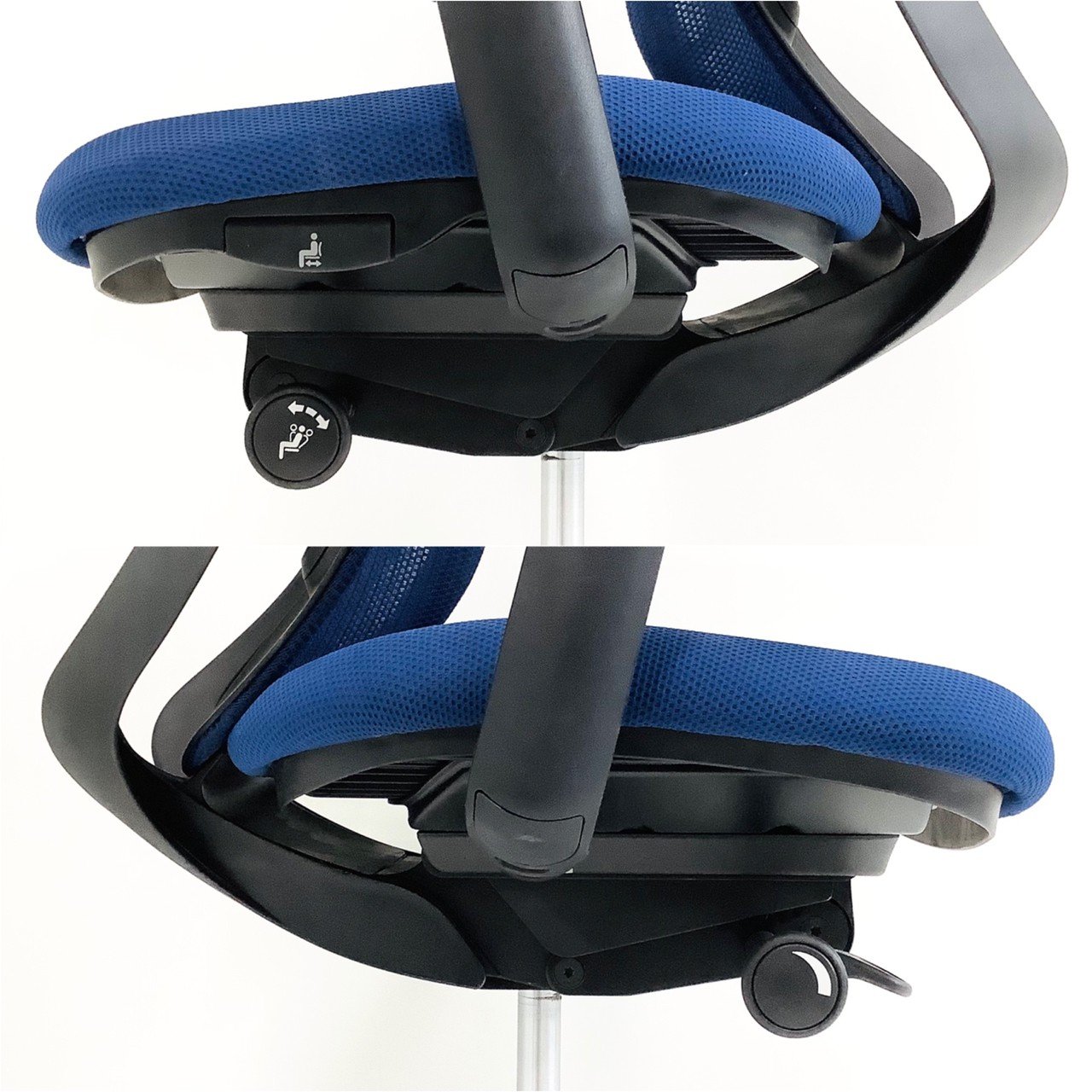 - 座面の左にあるレバー操作により、座面の奥行き調整が可能です。(ストローク:50mm)