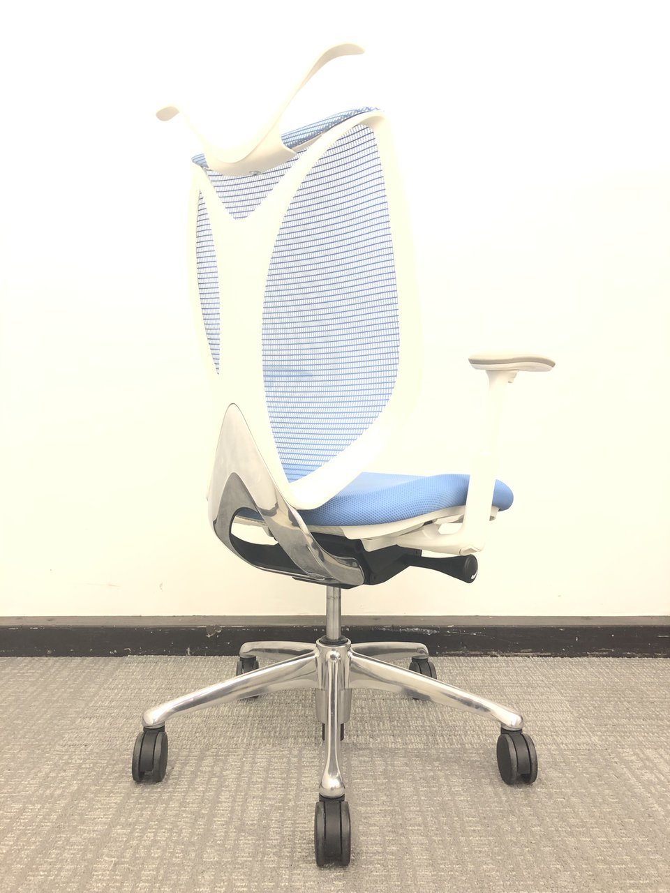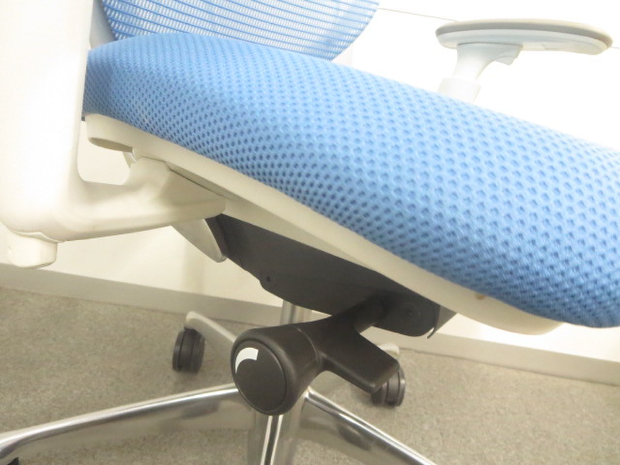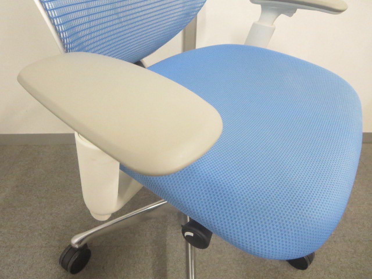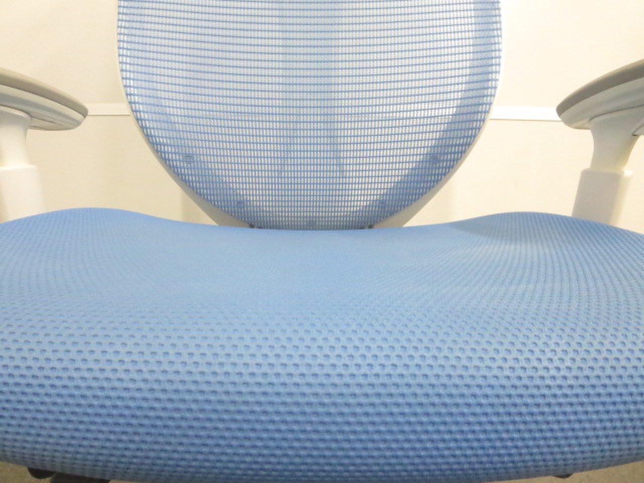 【前傾チルト付!流れるような美しいフォルムの最高級メッシュチェア!】■オカムラ(okamura)製 Sabrina(サブリナ) ハイバック 肘付き ■可動肘 ■背面メッシュ:アクアブルー 座面:ブルー ホワイトフレーム 【座面にダメージがあるためお値下げ商品】