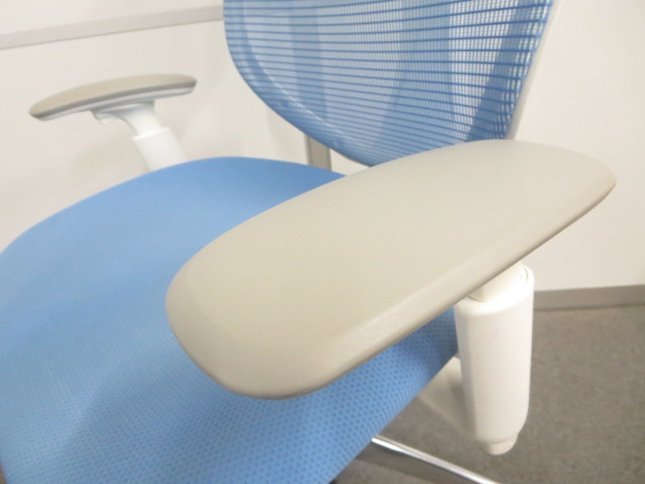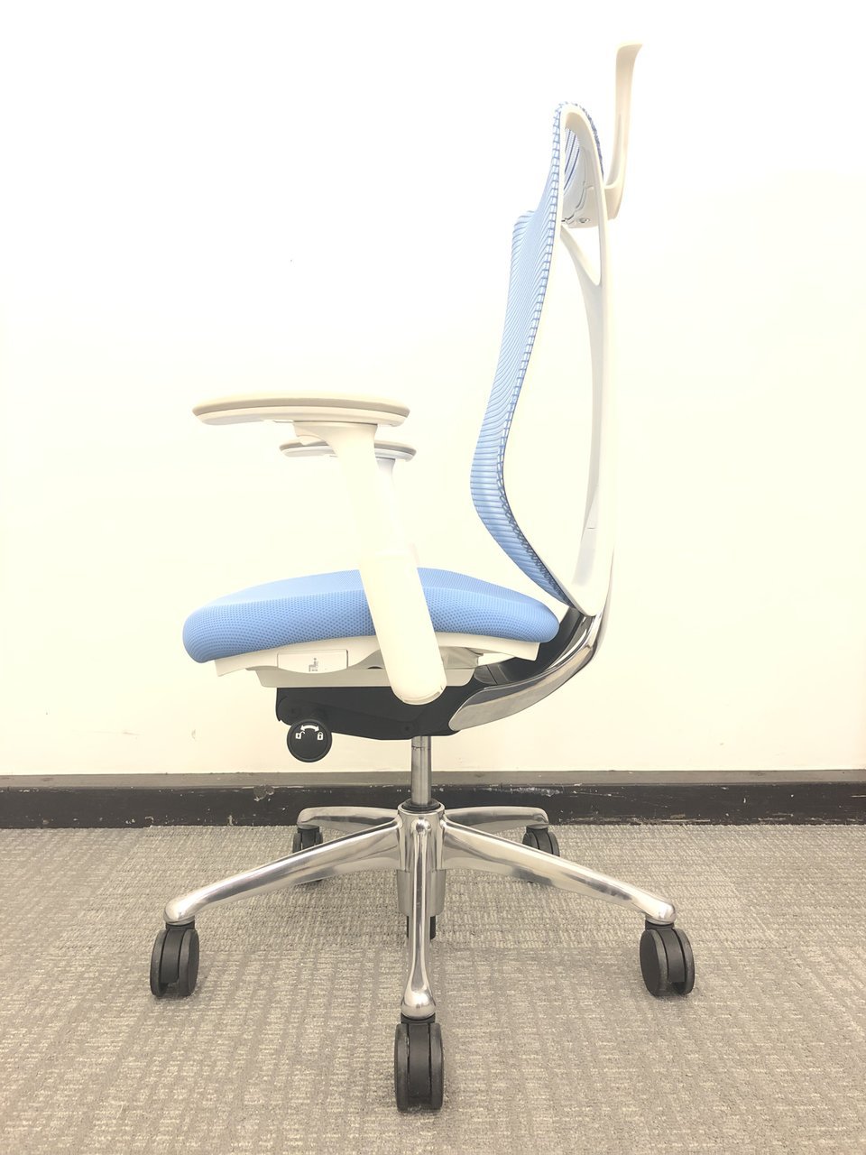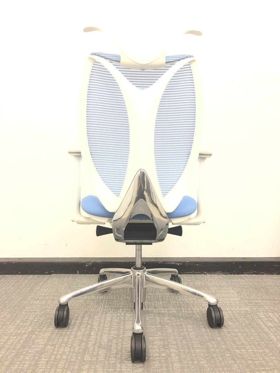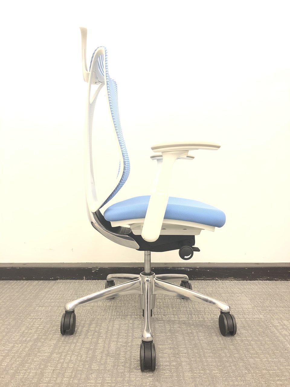 【前傾チルト付!流れるような美しいフォルムの最高級メッシュチェア!】■オカムラ(okamura)製 Sabrina(サブリナ) ハイバック 肘付き ■可動肘 ■背面メッシュ:アクアブルー 座面:ブルー ホワイトフレーム 【座面にダメージがあるためお値下げ商品】