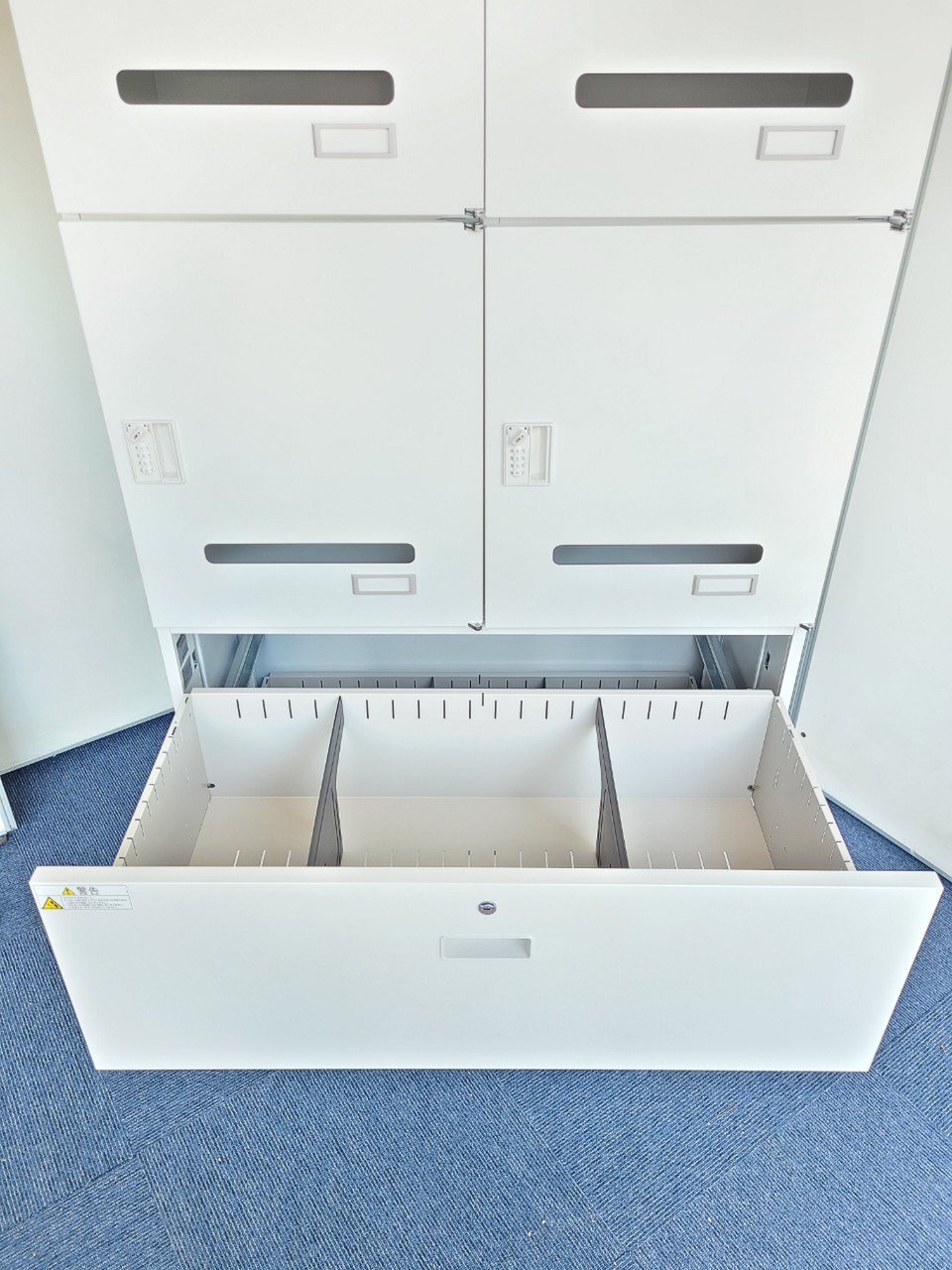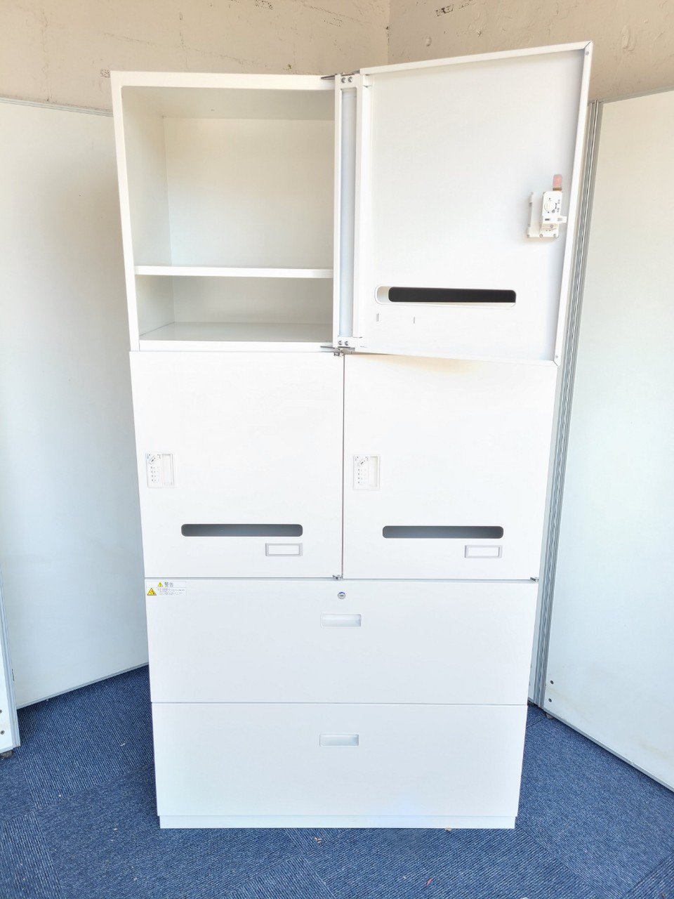 - 一部不具合ありそ引出の開閉不可、施錠不可、棚板無しといったの書庫の本来の効用を果たすための機能以外の一部が使用不可(例、扉、引出の開閉がしづらいなどがある。 )