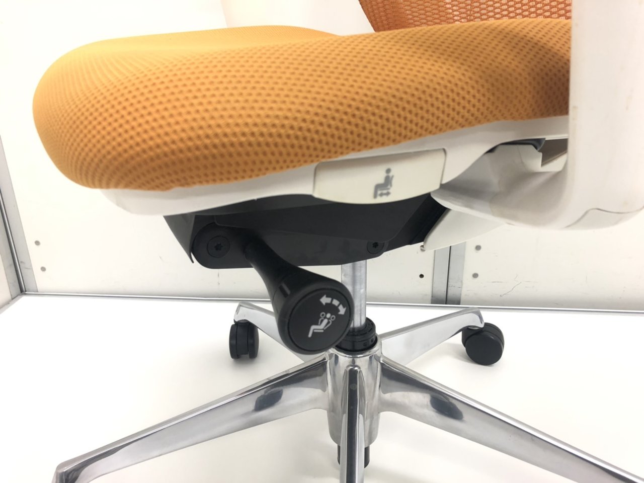 - 座面の左にあるレバー操作により、座面の奥行き調整が可能です。(ストローク:50mm)