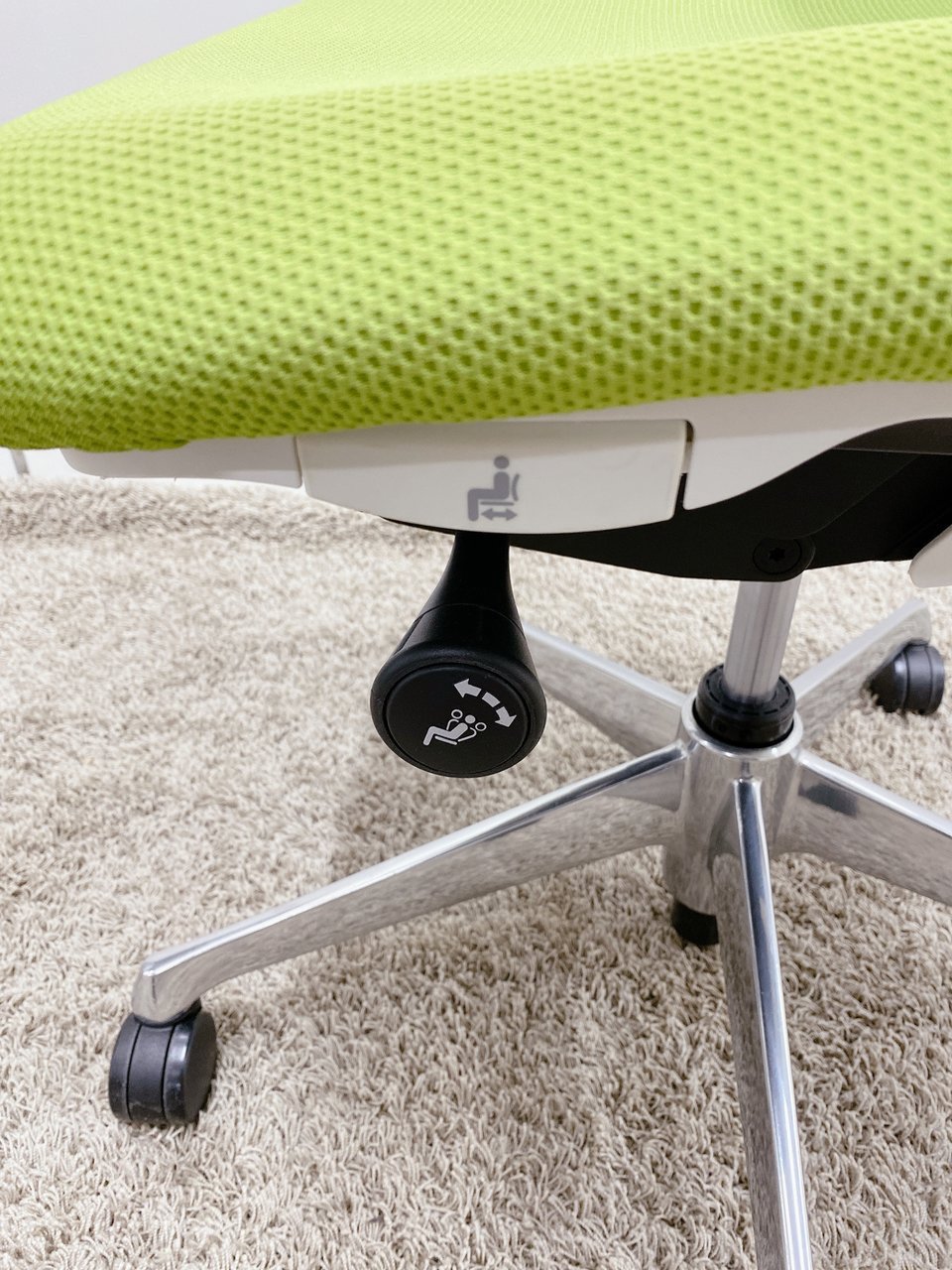 - 座面右下のダイヤル操作で、リクライニングの強弱調整が行えます。これまでのダイヤル式よりも、少ない回転数で、最弱?最強の調整が可能です。