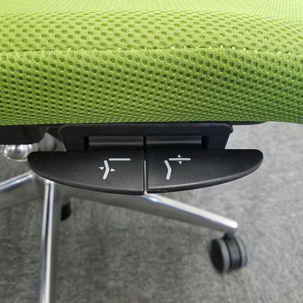 - 座る人の体格に合わせて、シート奥行きは前後54mm、高さ100mmの調整が可能です。また、調整レバーを座面シートの側面に設けることで、座ったままの姿勢で操作することができます。