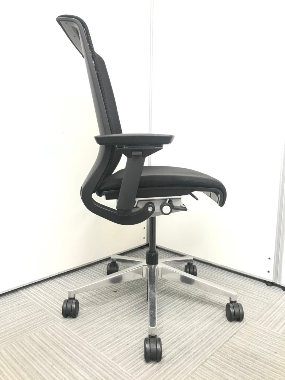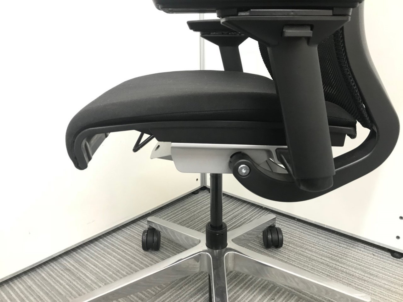 快適な座り心地に不可欠な調節機能である、上下昇降、座面の奥行き調整、リクライニングなどを備えており、操作もわかりやすく好評です。 特に、座面の奥行きは、座面下の左右に通った細いバーで調整でき、座ったままで軽やかに滑るように調整が可能です。 価格面では、新品では高めですが、中古は流通も多く、定価の3割前後の価格で高級チェアの座り心地を手に入れることができます!