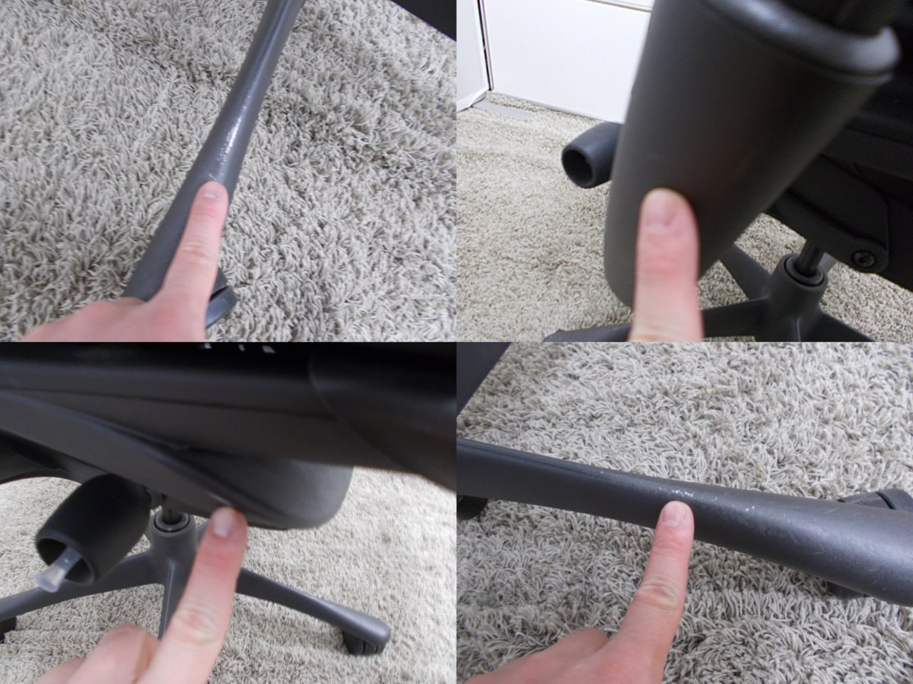 - 目立つ箇所あり傷・破れ・ほつれ・へたり・しわが多数または深い傷・破れ・ほつれ・へたり・しわが一部ある。※座面・背もたれ、シェル、脚部等にある。