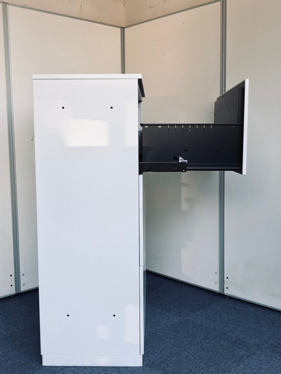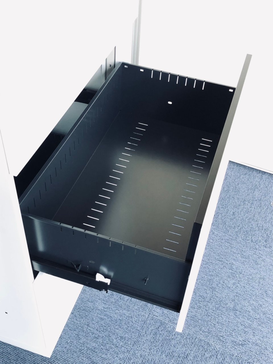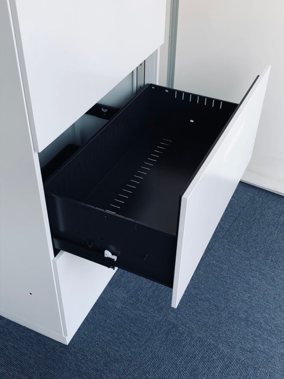 - 両開きタイプは扉が180度開き、通路の邪魔になりません。ラテラルタイプは引出しが限界まで出せ、出し入れ楽々。