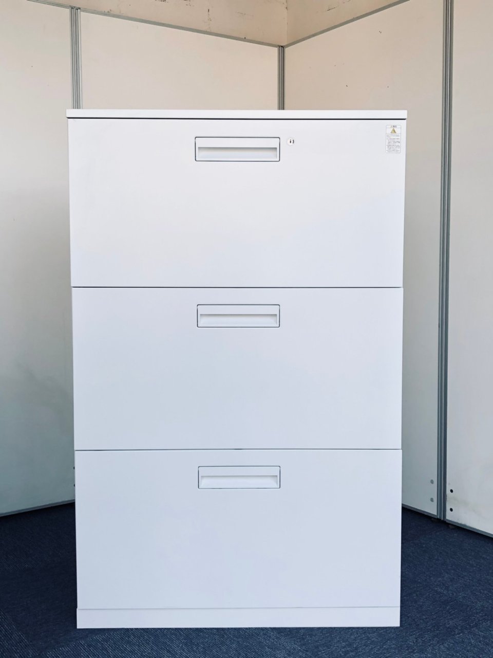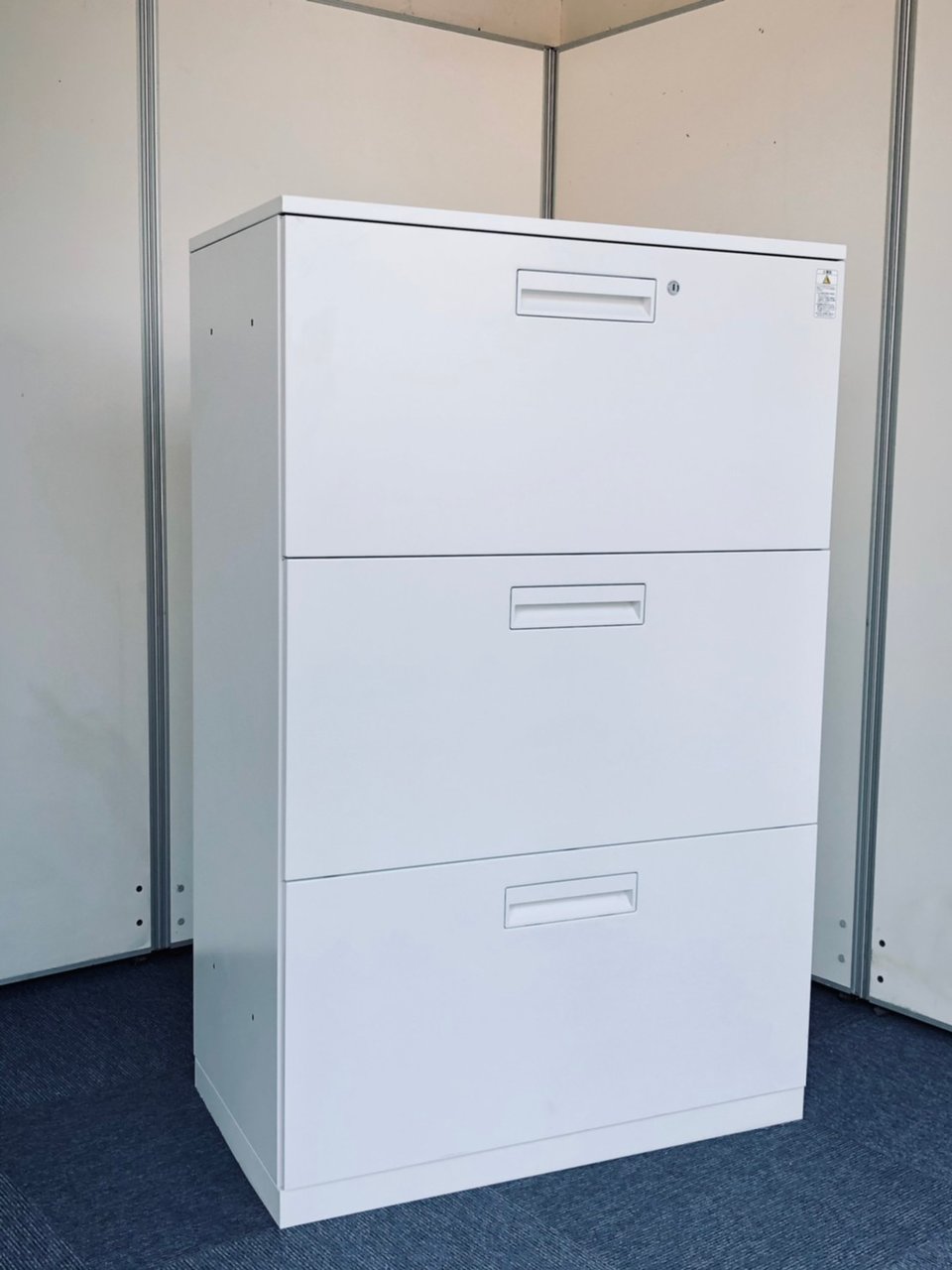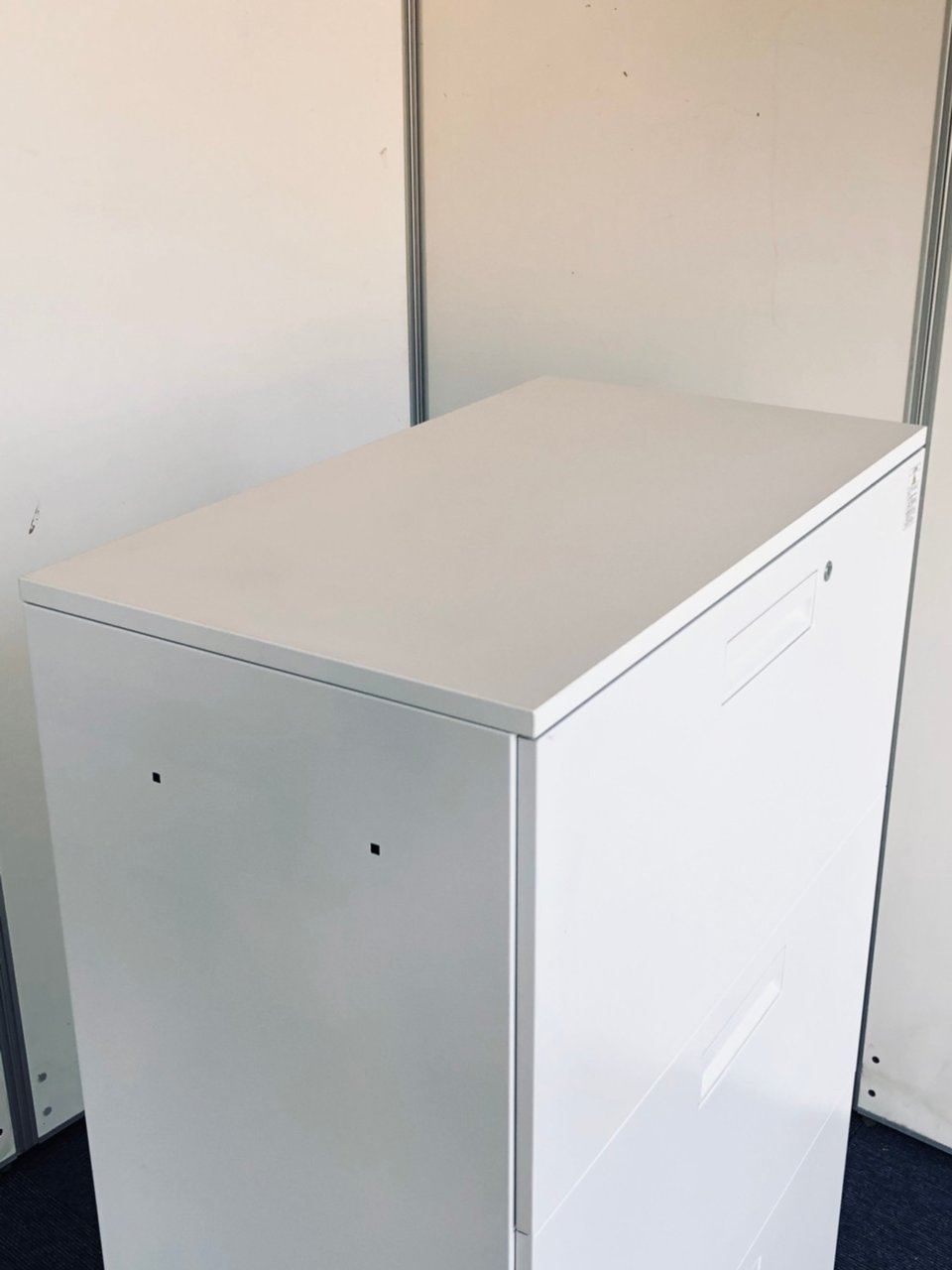 【4台入荷】【収納力抜群の3段ラテラル書庫!A4書類が大量に収納可能!】■コクヨ(KOKUYO)製 エディア(EDIA)シリーズ 3段ラテラル ローキャビネット ■天板/ベース付き ■ホワイト ■シリンダー錠
