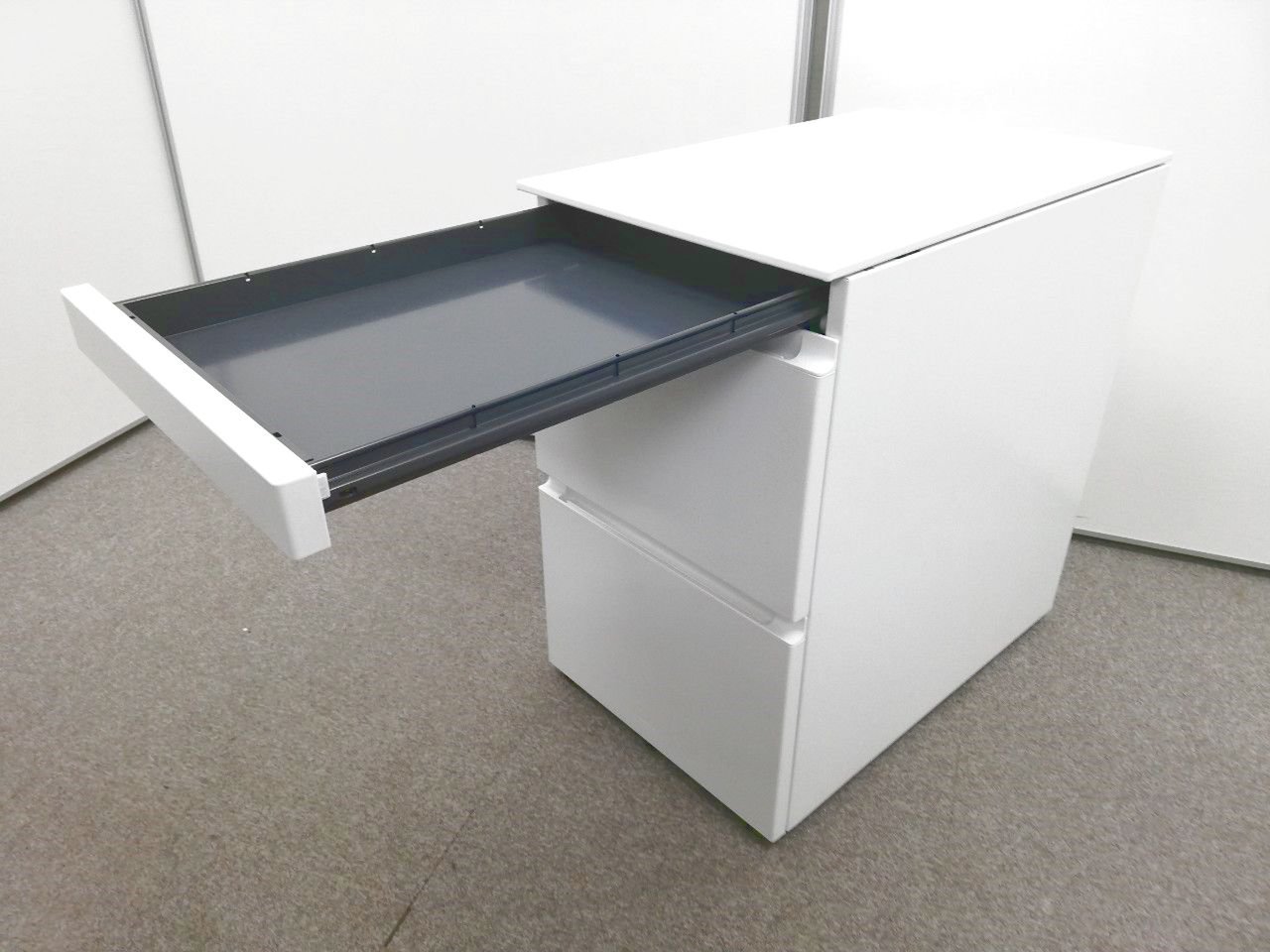 通常規格(H700mm)で天板下に引出しが付いているデスクの下には収納できないハイタイプです。