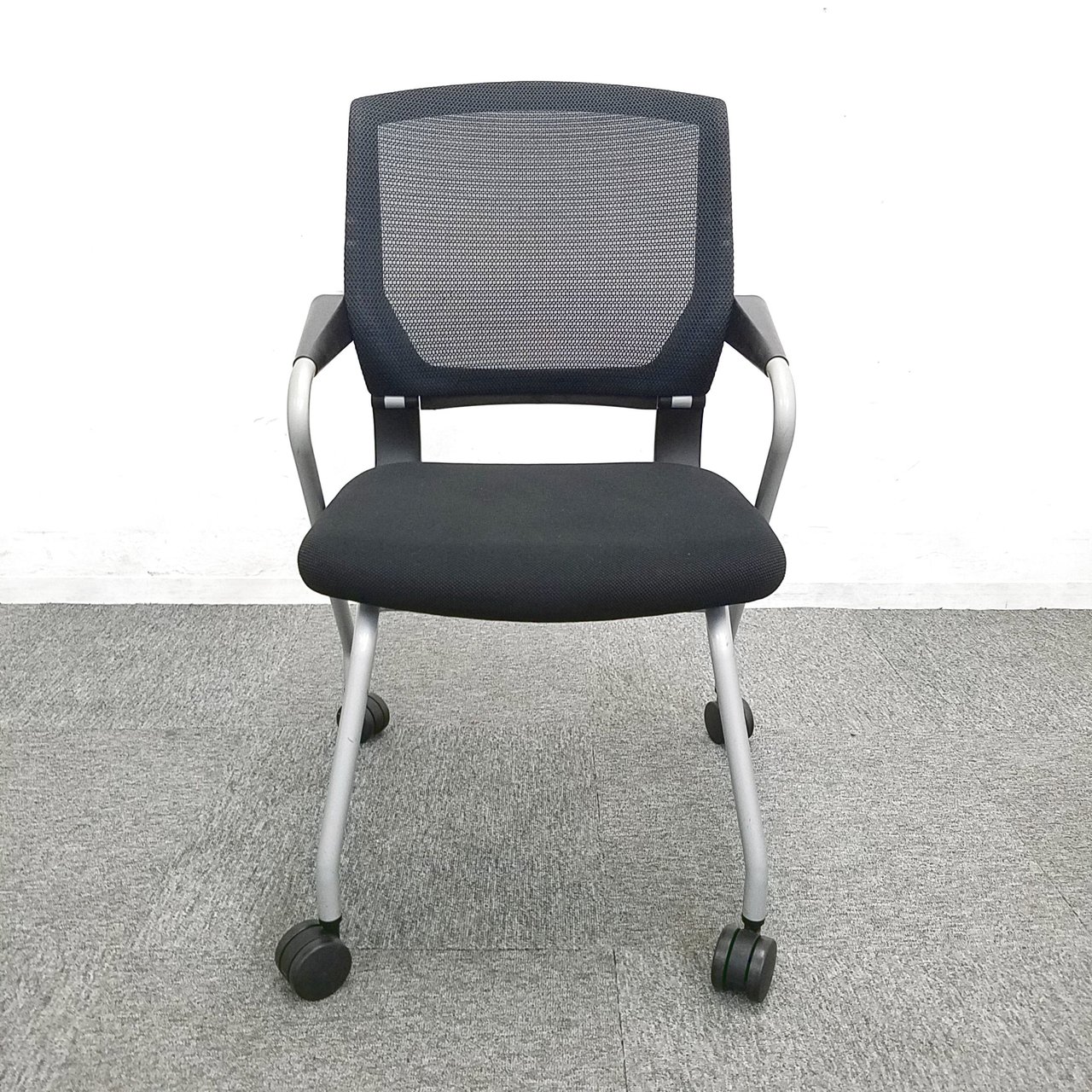 【背にフィットする快適メッシュ!横に積めて収納できるネスティングチェア!】■コクヨ(KOKUYO)製 サテリテチェア 肘付ミーティングチェア ■キャスター付 ■背面メッシュ ■ブラック 【会議室・セミナールームにもおすすめ!】