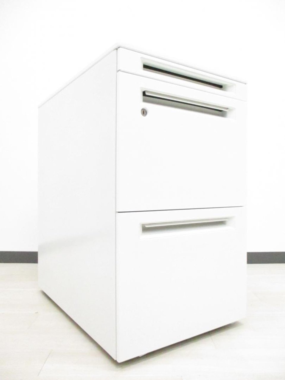 【正面に取っ手が無いフラットなデザイン!キャスター付でレイアウト変更がスムーズ!】■オカムラ(okamura)製 プロユニットシリーズ 3段ワゴン フリアド用ワゴン H650㎜ ■ホワイト ■シリンダー錠 ※キズ・塗装剝がれ有