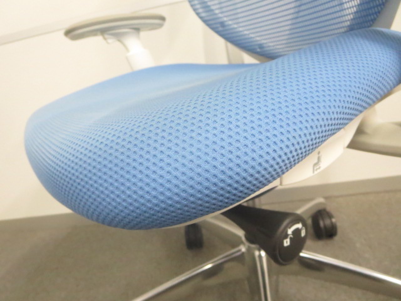 【T11】【T9】【K7】【商品入替のため、残り5脚限り】オカムラ製 サブリナシリーズ アクアブルー 背もたれ/アクアブルーx座面/ダークブルーのツートンカラー ホワイトフレーム アジャストアーム※可動肘 前傾チルト付 流れるような美しいフォルムの最高級メッシュチェア! 肘付きハイバックチェア!!