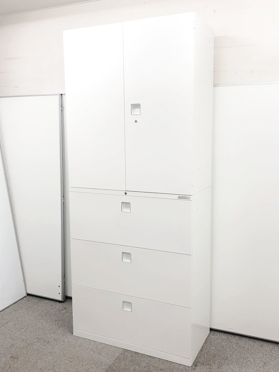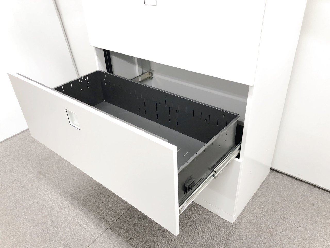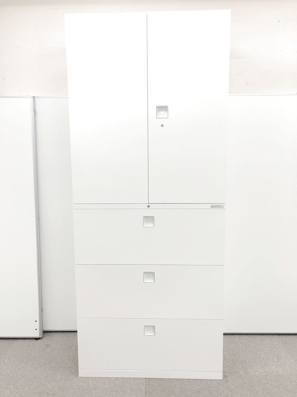 スライド式の扉+引き出しタイプの便利な書庫セットが入荷!使い勝手抜群のハイキャビネットが入荷! ■オカムラ/レクトライン/ホワイト 2枚引き戸+3段ラテラルキャビネット