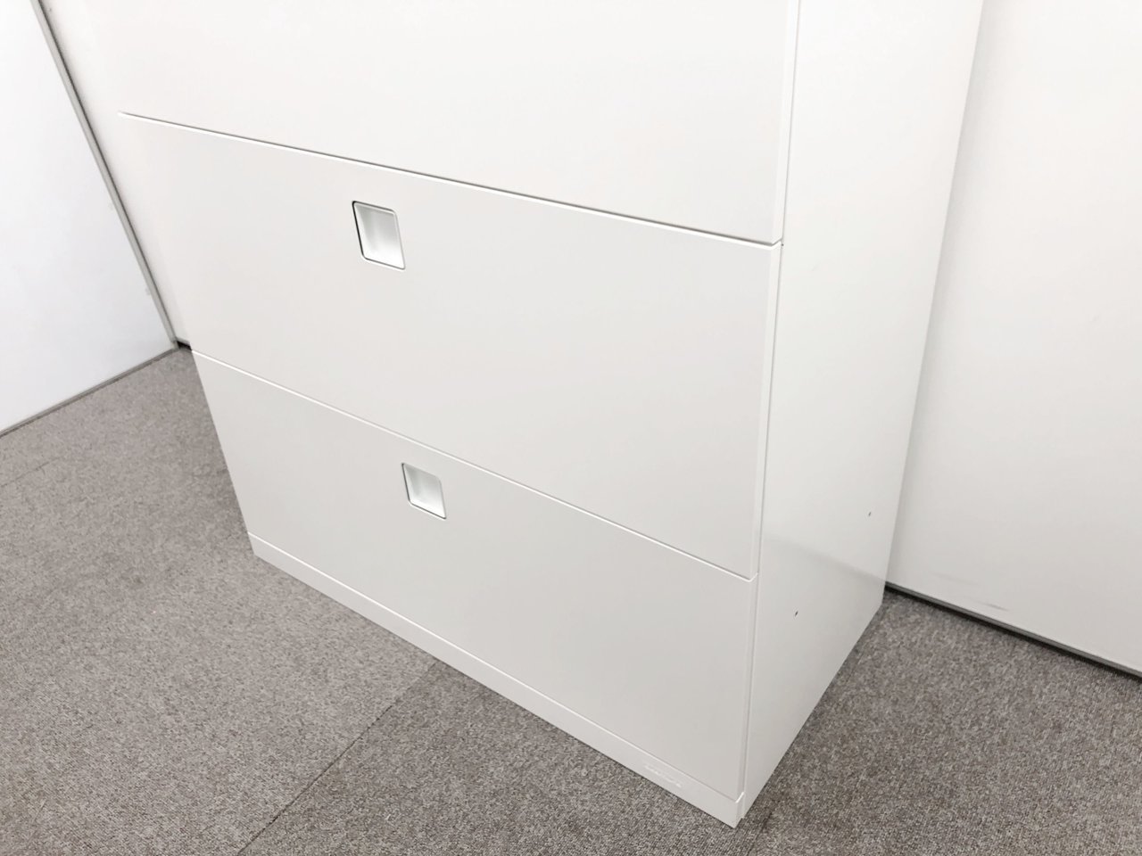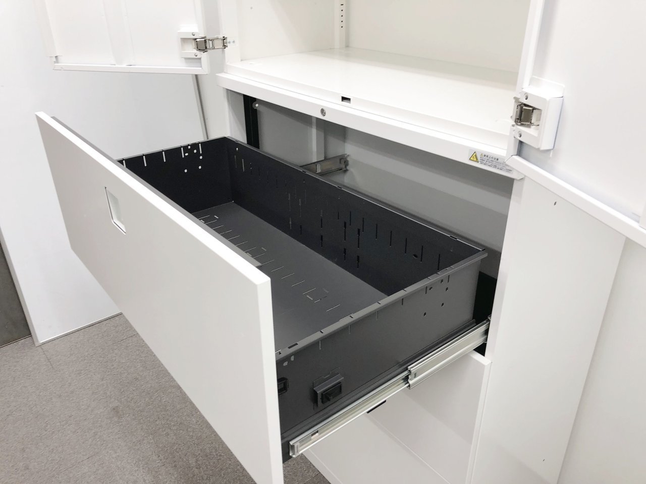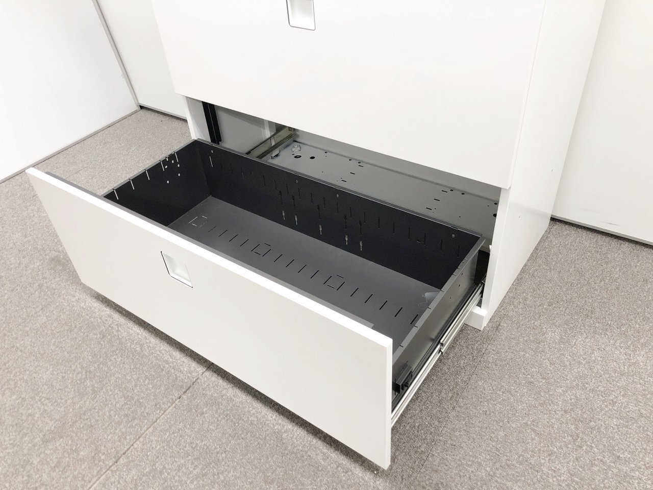スライド式の扉+引き出しタイプの便利な書庫セットが入荷!使い勝手抜群のハイキャビネットが入荷! ■オカムラ/レクトライン/ホワイト 2枚引き戸+3段ラテラルキャビネット