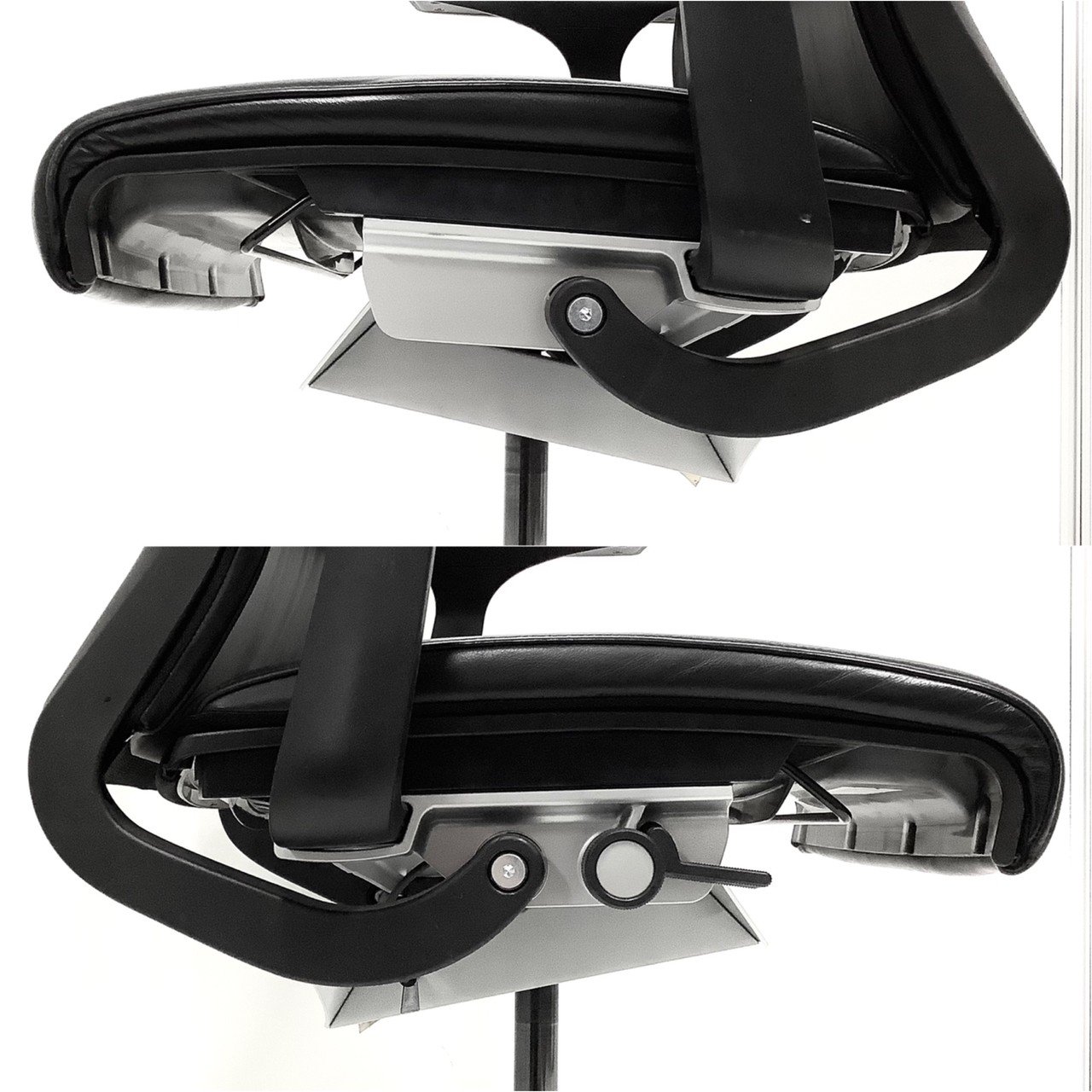 - レバーを引き上げながら座面を前後にスライドさせ、レバーを放すとロックします。背もたれに身体をつけた状態で膝の裏側と座面のエッジの間に5-8センチほどの隙間ができるのが理想的です。