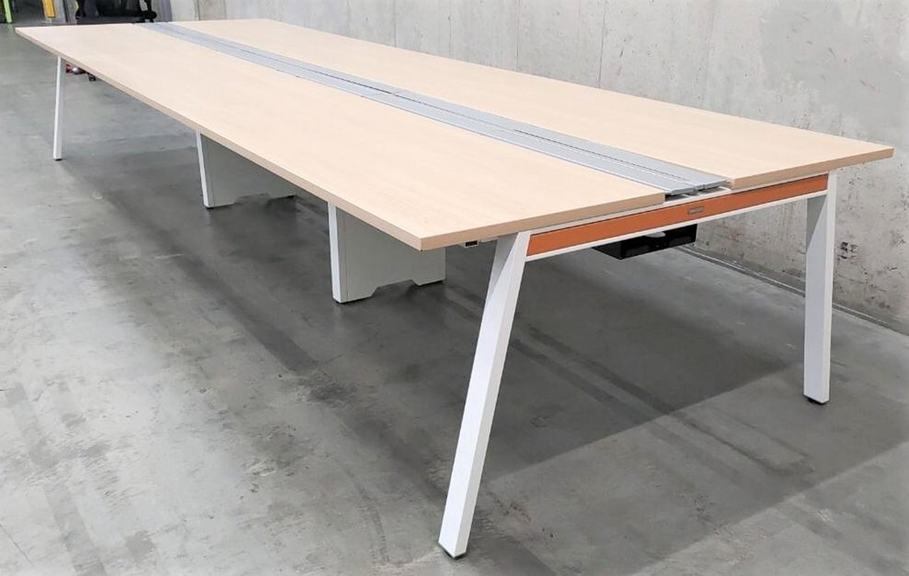 【デザインを追求するならコレ!】■オカムラ製 フリーアドレスデスク(W4200mm) ■マニフィールド オレンジエンブレム ナチュラル木目カラー【倉庫在庫品】- 川崎店