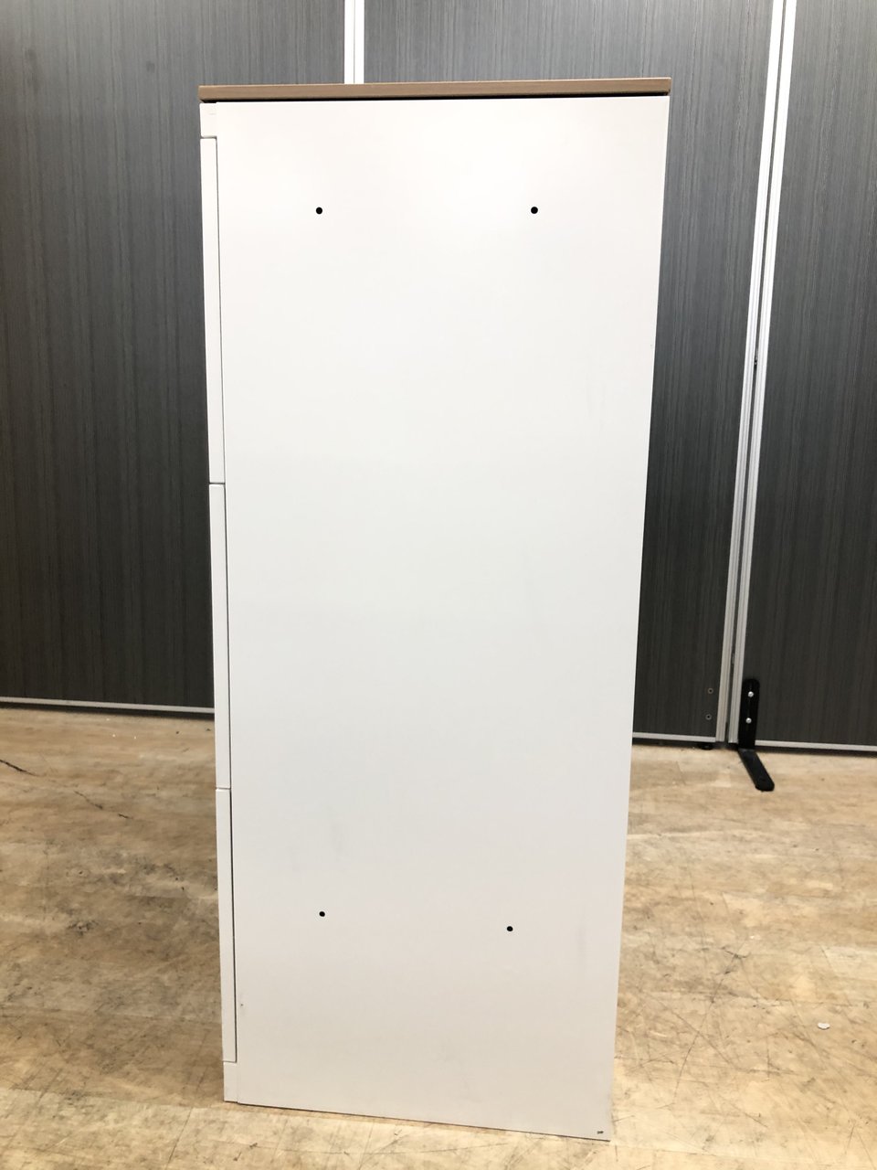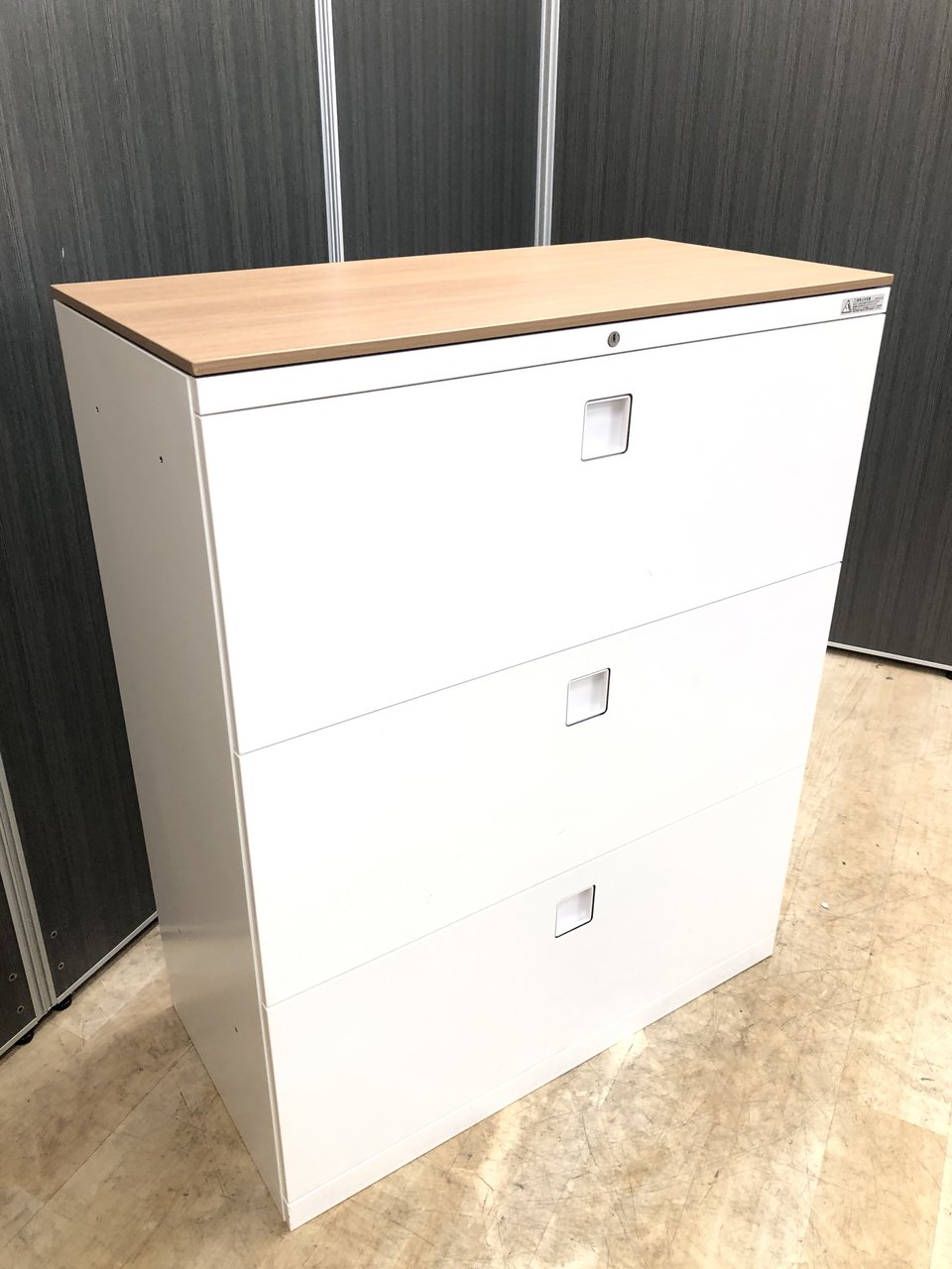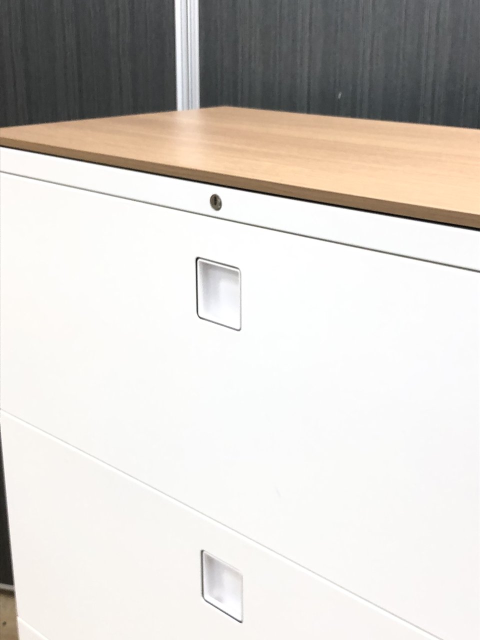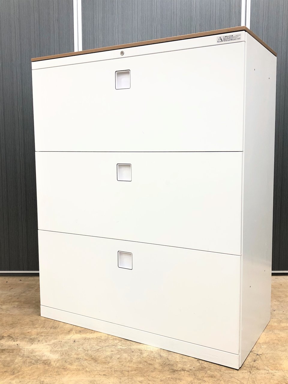 オカムラ レクトライン 3段ラテラル書庫 ホワイト天板 シリンダー錠 鍵付き ※取っ手部分に若干日焼けあり
