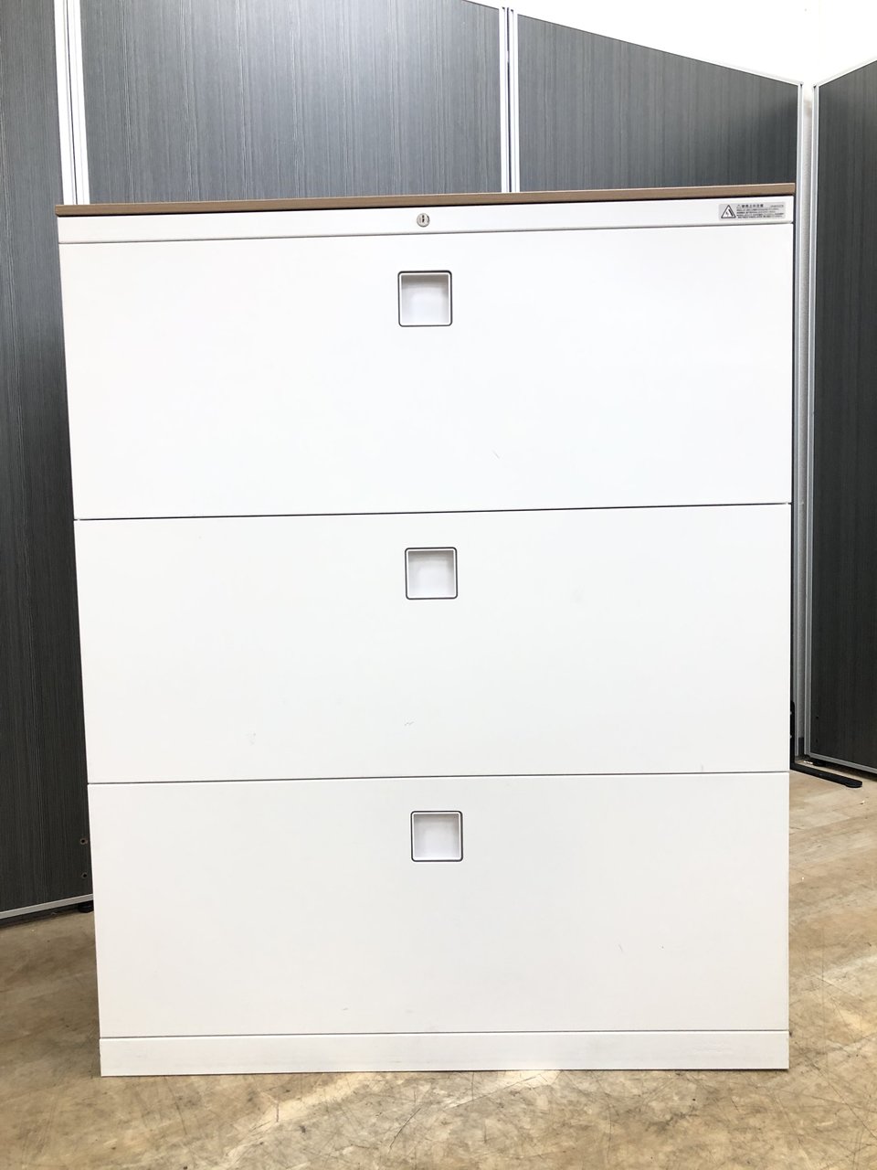 【ファイル収納にオススメ!高品質で使いやすい人気シリーズの3段ラテラル書庫!】■オカムラ(okamura)製 レクトラインシリーズ 3段ラテラル書庫 ローキャビネット H1100㎜ ■ホワイト ■シリンダー鍵 ■天板付き(天板:ホワイト) ※日焼け有