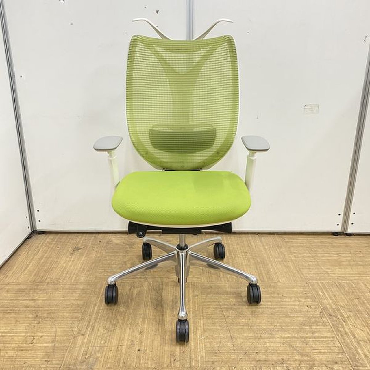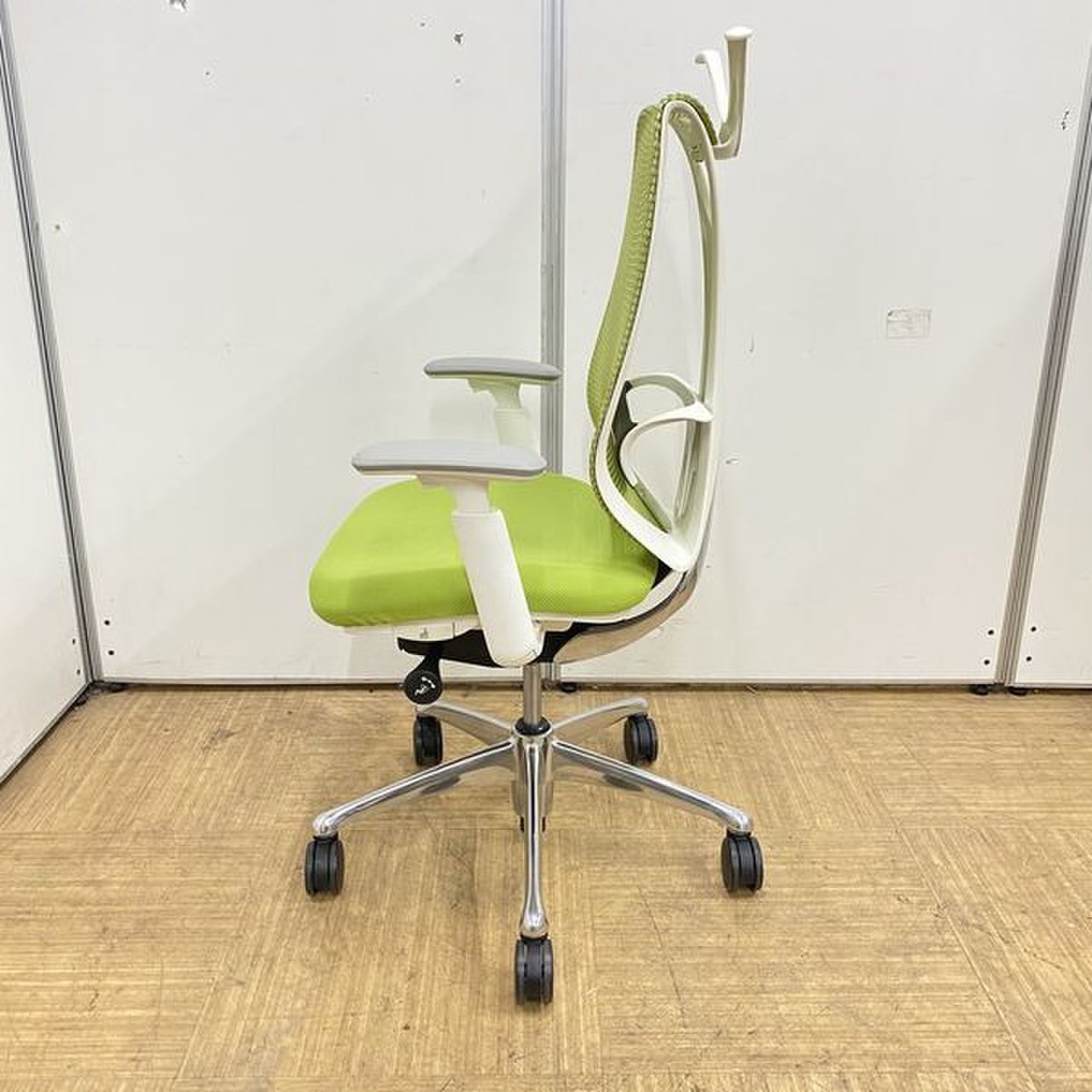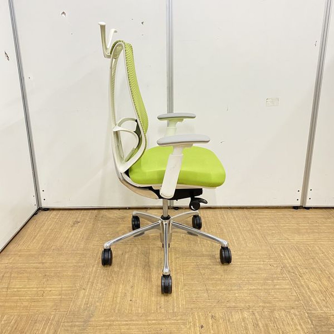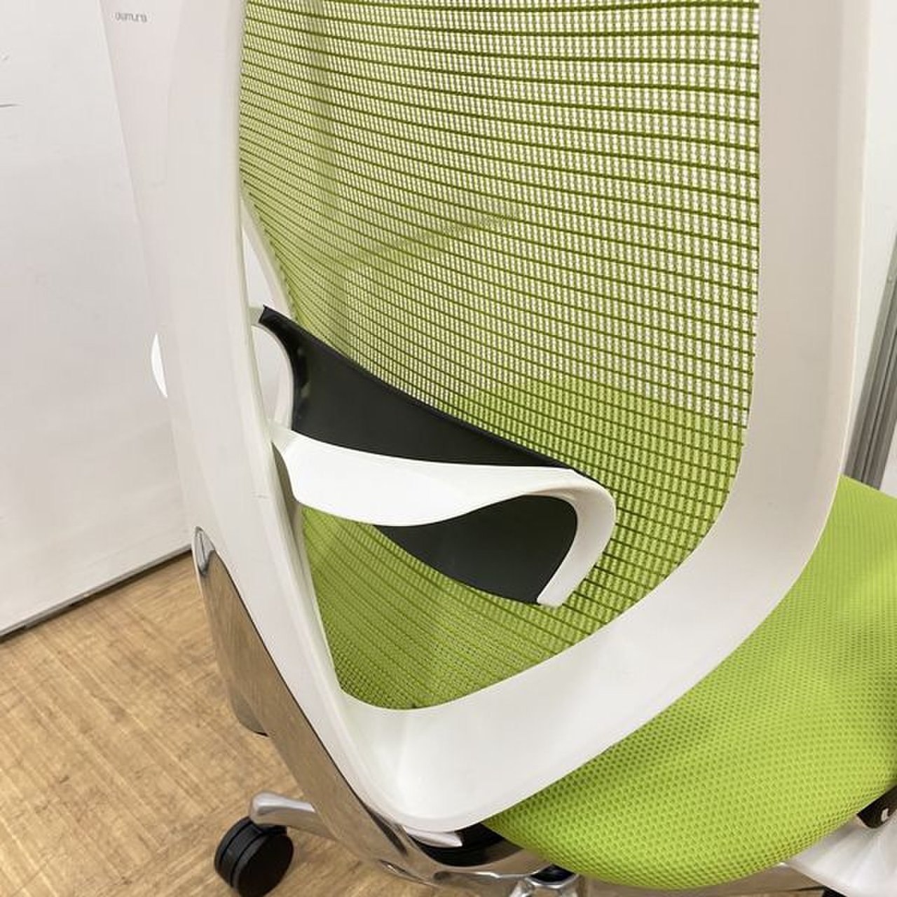 【美しい曲線&透明感のあるメッシュ】■オカムラ製 サブリナチェア ダークグリーン アジャストアーム付 ホワイトボディ ハンガー付【※外部倉庫在庫品(店頭在庫無)】【BR】