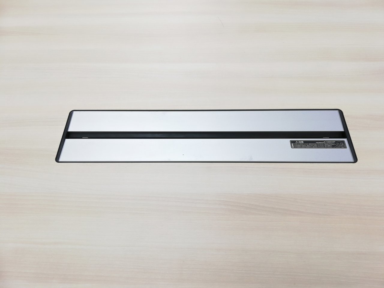 また、天板中央付近には、開閉可能な配線口が2か所ついております。電源タップやPC配線はこの中に収納することが可能です。