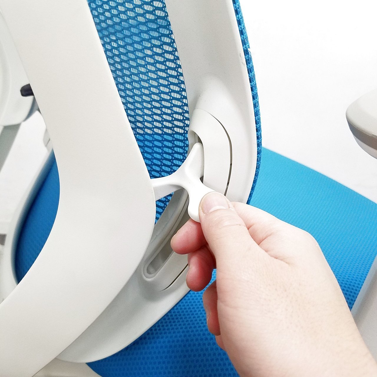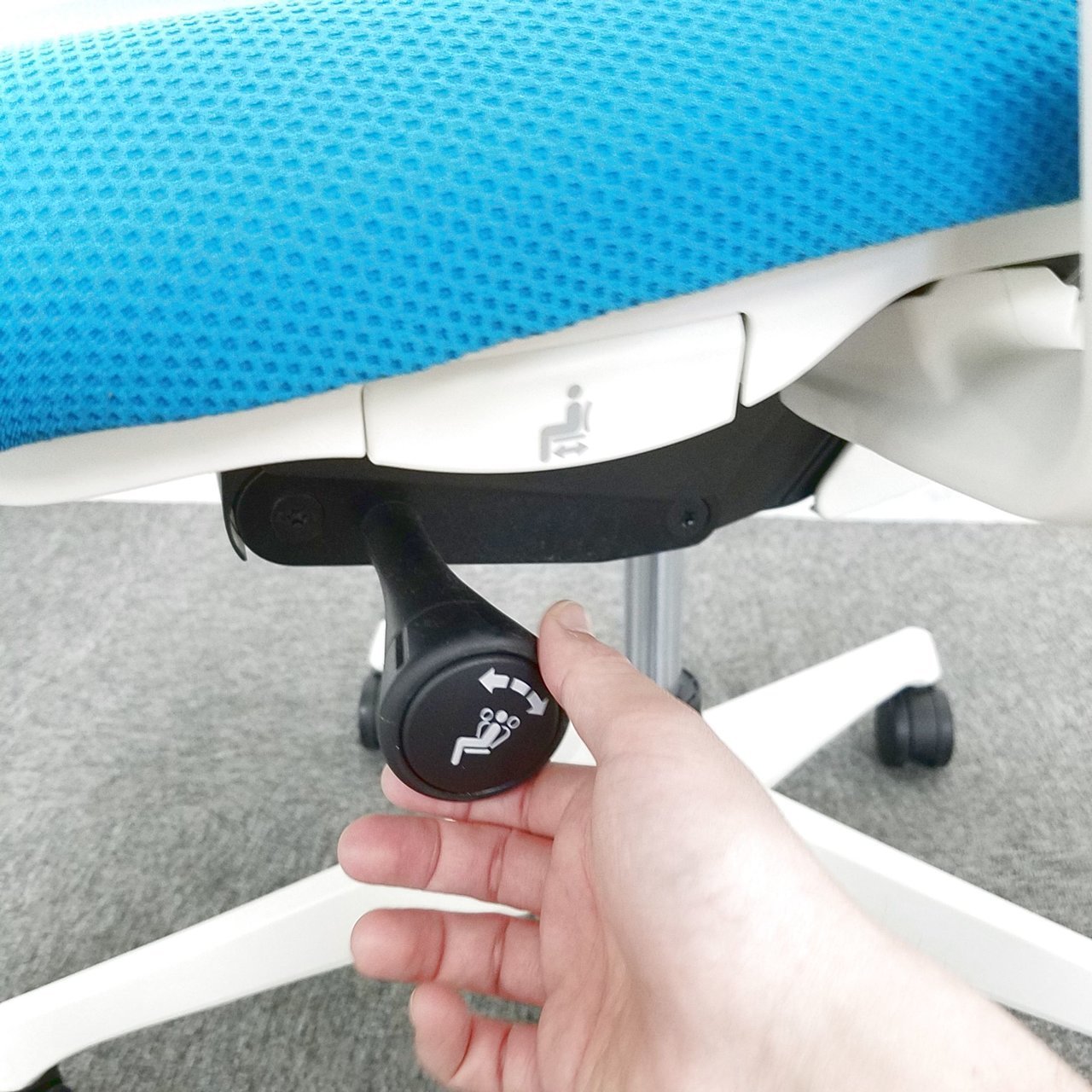 - 座面右下のダイヤル操作で、リクライニングの強弱調整が行えます。これまでのダイヤル式よりも、少ない回転数で、最弱?最強の調整が可能です。