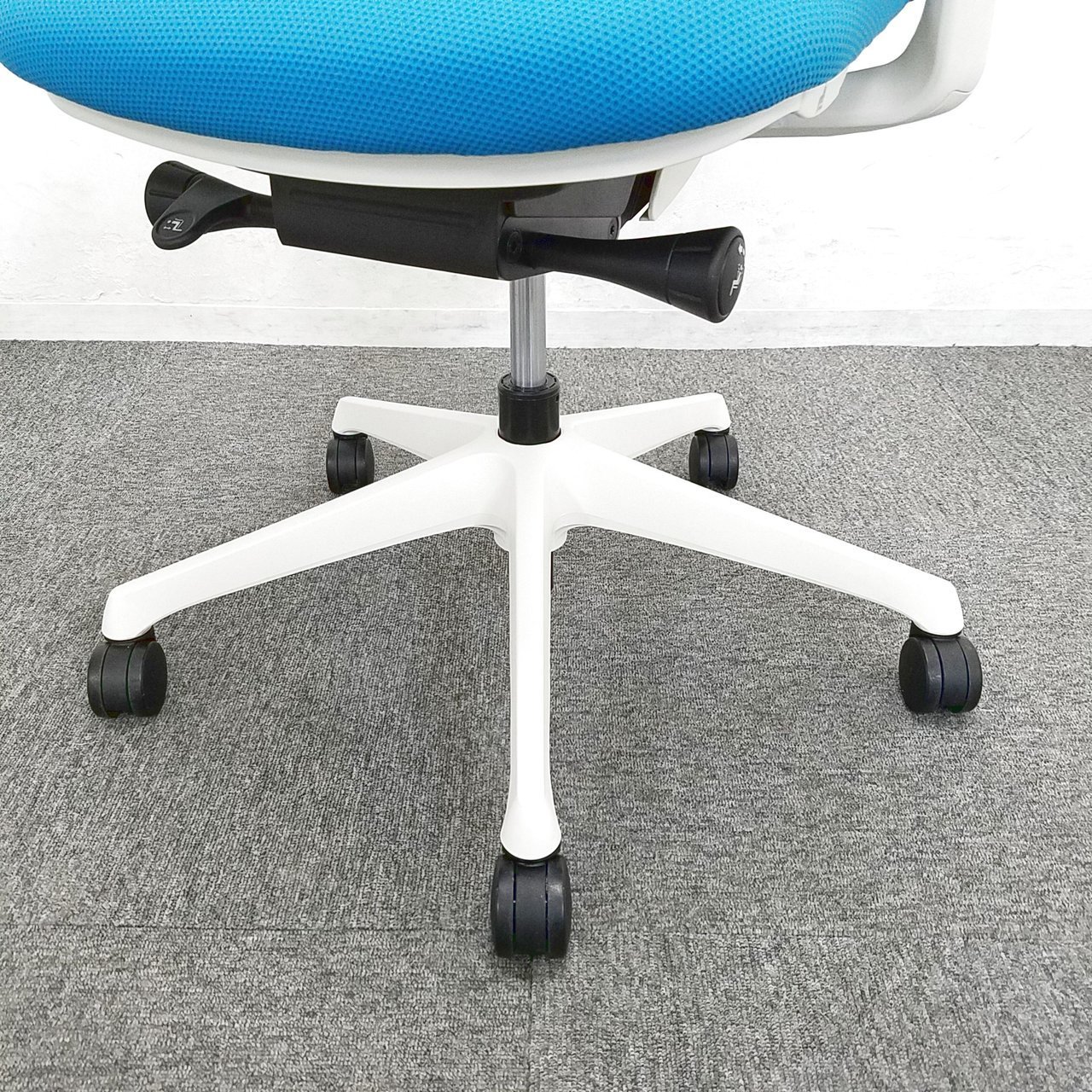 - 座面左下のダイヤルでリクライニングの固定と解除が行えます。 前傾ポジションをとることも可能です。