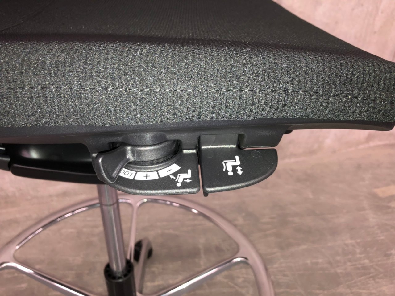 - 座面の高さ調節や背と座がシンクロしてスライドするアンクルチルトリクライニングなど、基本的な調節機能を搭載。