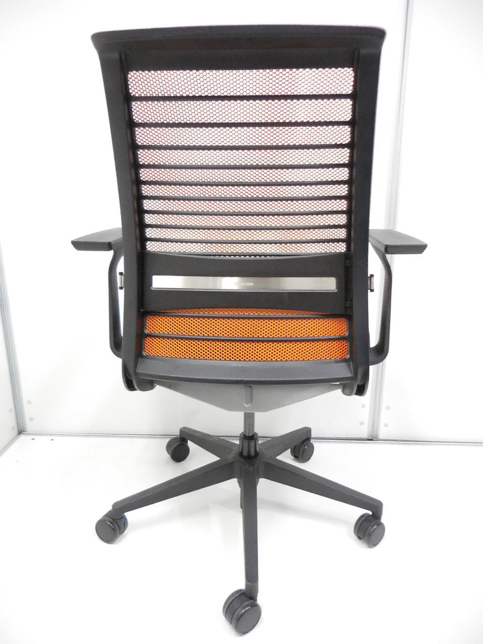 【定価約16万円】【ワイヤーが体にフィットするアメリカ発の大人気商品!長時間の着座ストレスを軽減!】 ■スチールケース(Steelcase)製 シンク(think)チェア 肘付き ハイバック ■メッシュバック ■固定肘/ランバー付 ■背面:オレンジ/座面:ブラック〈岐阜・愛知・三重・静岡・福井〉