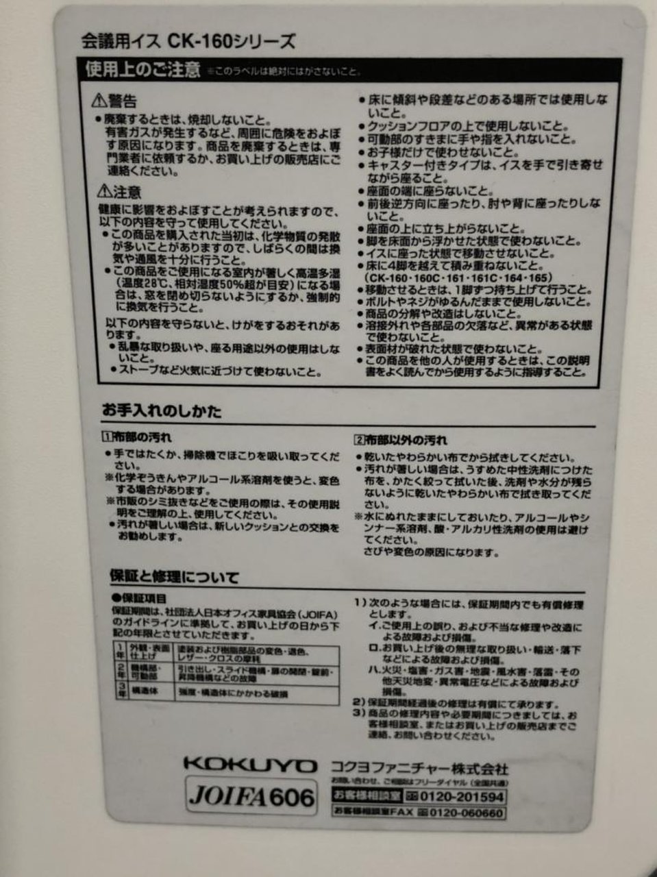 - 不具合多数そのチェアの本来の効用を果たすための機能に不具合ある。(例、オフィスチェアの上下昇降キャスター付きミーティングチェアのキャスター使用不可のような不 具合)