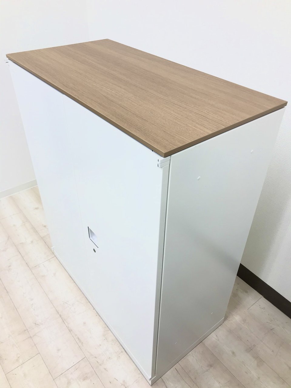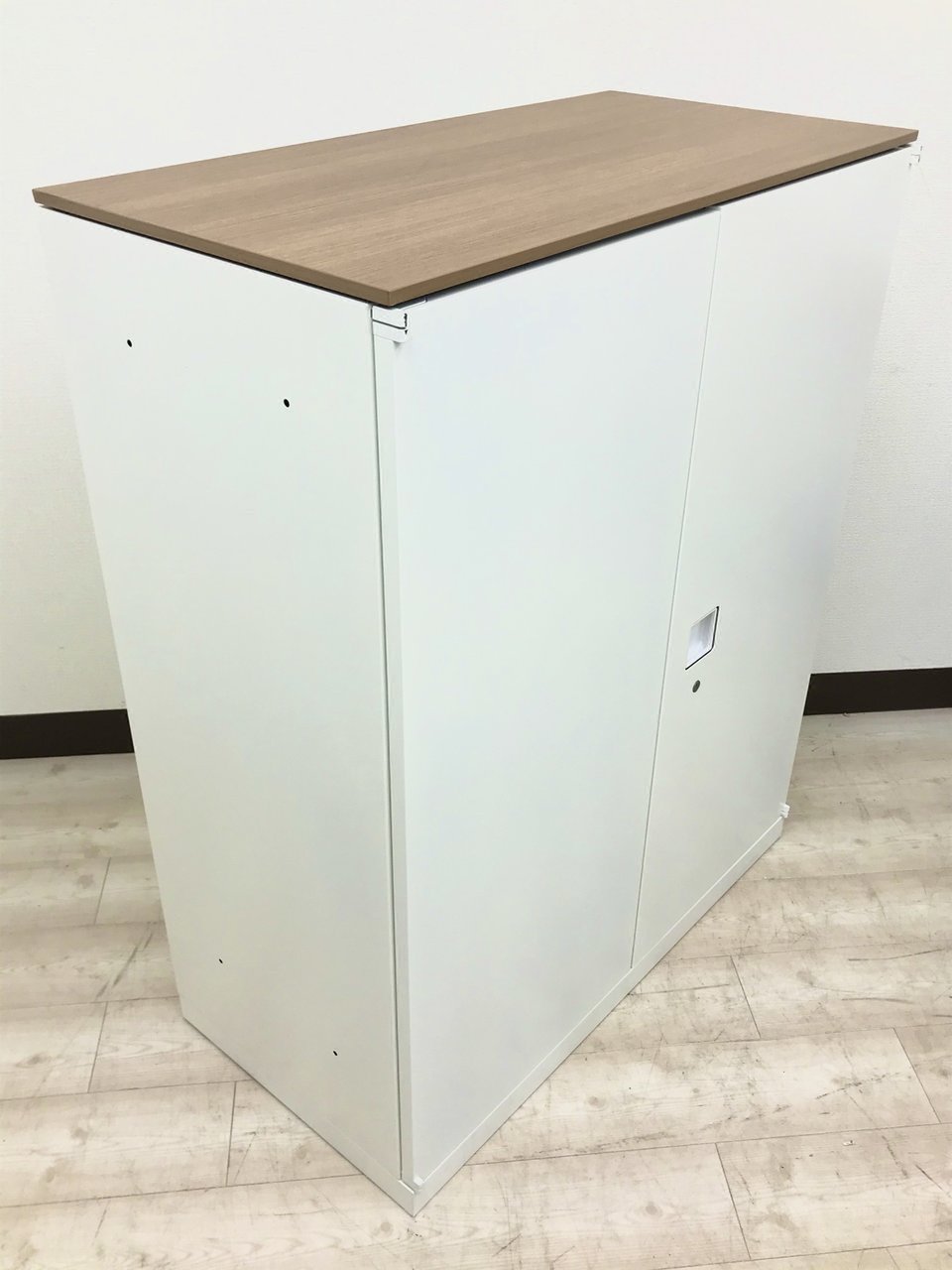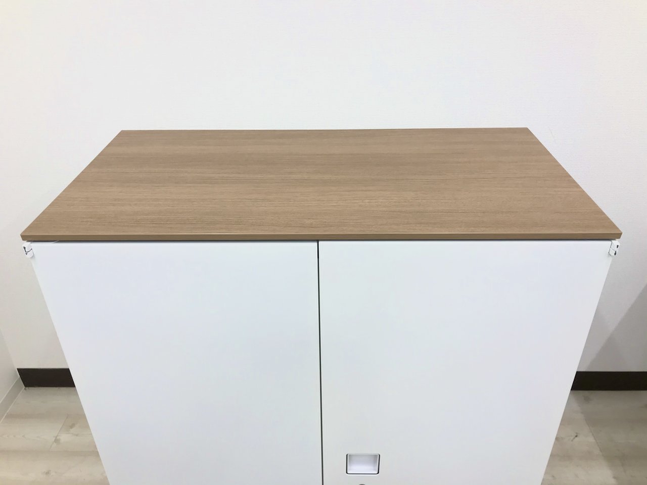 【オフィスの書類をスッキリ整理!取っ手がどの方向からでも開くマルチハンドル!】■オカムラ(okamura)製 レクトラインシリーズ 両開き書庫 ローキャビネット ■本体色:ホワイト ■シリンダー錠 ■ナチュラル天板付き