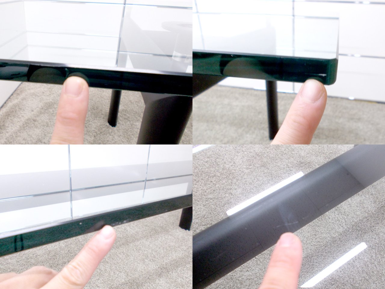 - 目立つ箇所複数あり深い傷・凹みが商品全体にある。(例、天板、幕板、棚板、サイド部分、脚部等にある。)