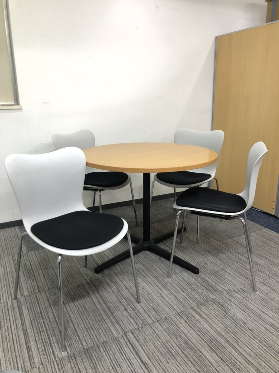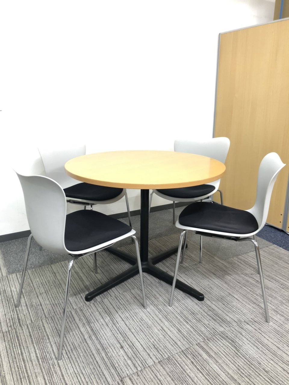【セット価格】ナチュラルの丸テーブル+ブラック/ホワイトのミーティングチェア|内田|リフレッシュスペース【中古家具】【新大阪】【北摂】【淀川区】【北区】- 新大阪店