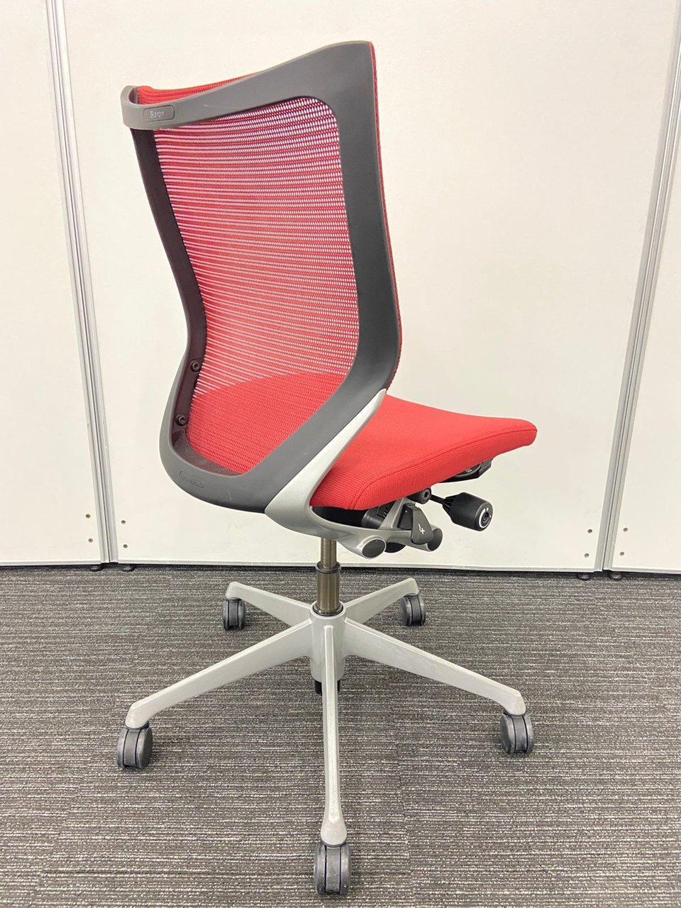 発売当時、既に人気を博していたオカムラの高級チェア、コンテッサから手元で座高調整ができるスマートオペレーション機能を取り除くなどしてリーズナブルにしたのがバロンです。その際に少しだけコンパクト化されました。そのことが、日本人の体格、日本のオフィス、家庭環境に適し、国内で多くのシェアを獲得する要因の一つになったのではないかと思います。