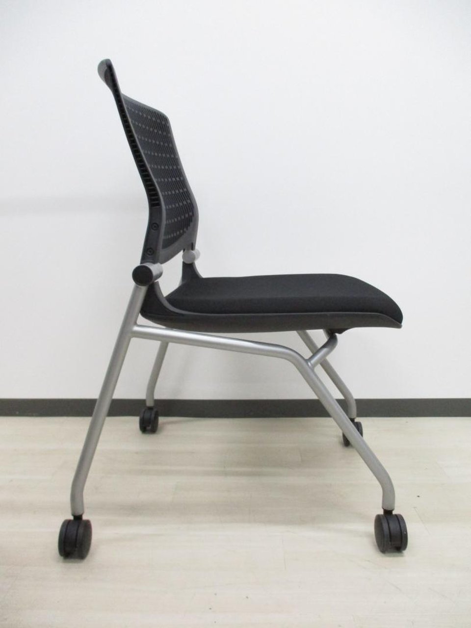 【しなやかにワーカーを受け止める洗練されたデザイン!使わない時は重ねて収納可能!】■オカムラ(okamura)製 グラータ (Grata) 肘無し ミーティングチェア ネスティングチェア ■背面樹脂メッシュ/背パッドなし ■座面:ブラック ■キャスター付