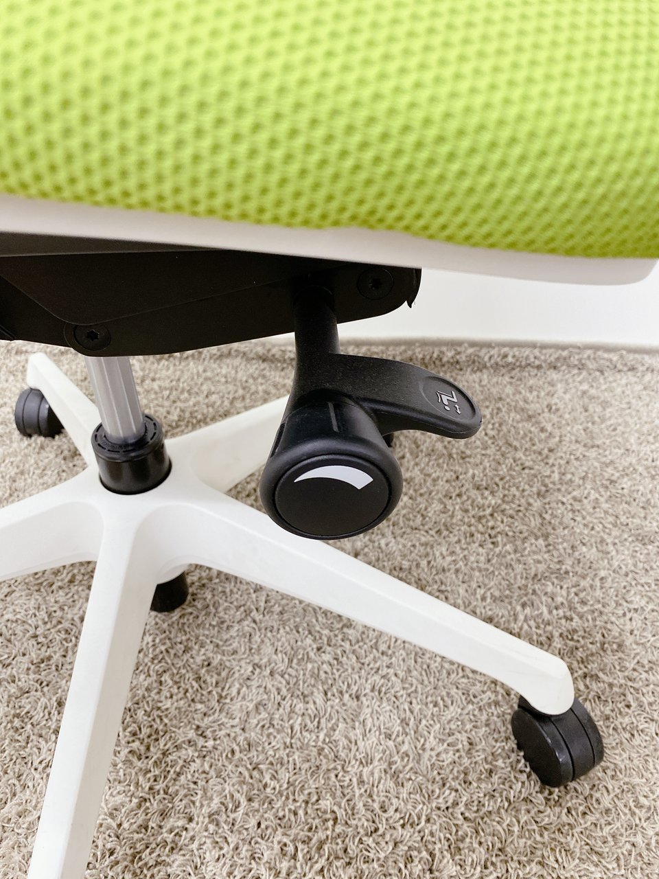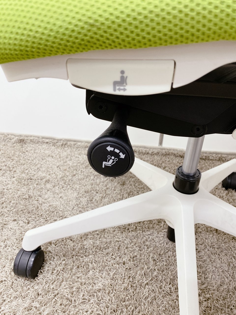 - 座面右下のダイヤル操作で、リクライニングの強弱調整が行えます。これまでのダイヤル式よりも、少ない回転数で、最弱?最強の調整が可能です。