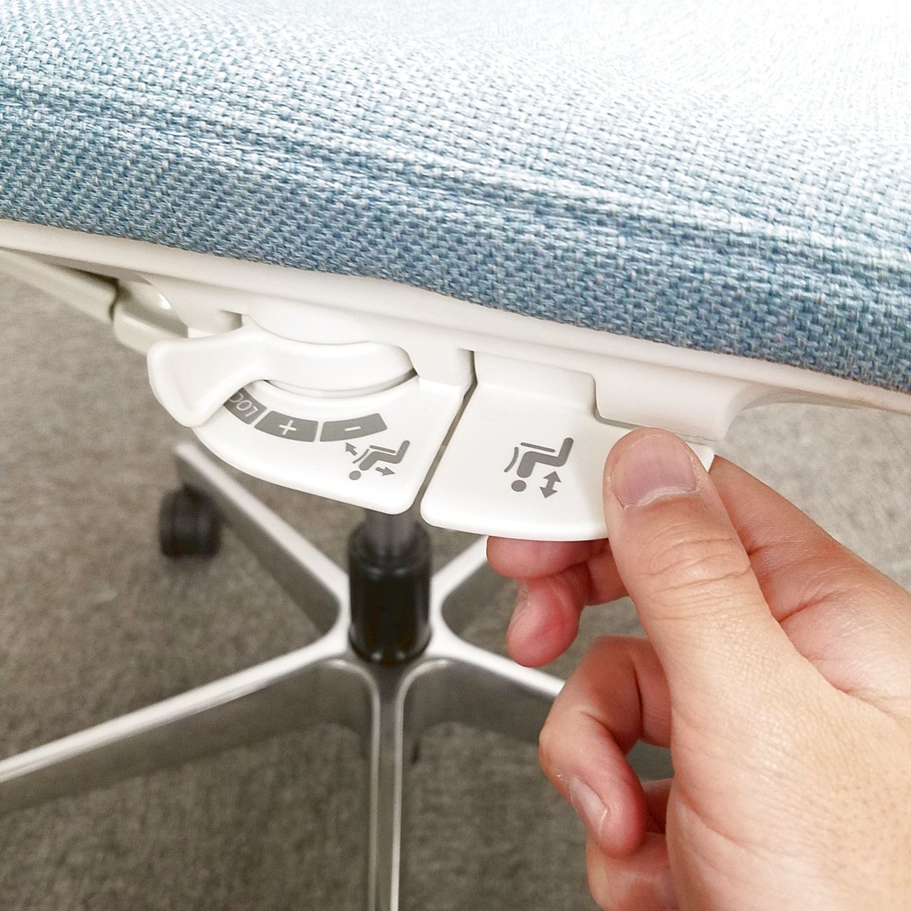 - 座面の高さ調節や背と座がシンクロしてスライドするアンクルチルトリクライニングなど、基本的な調節機能を搭載。