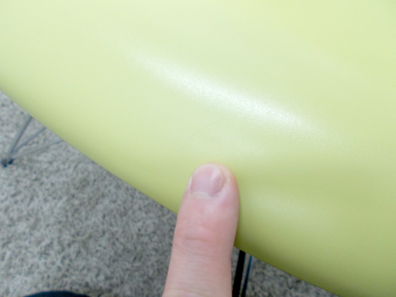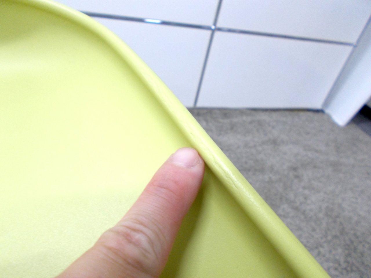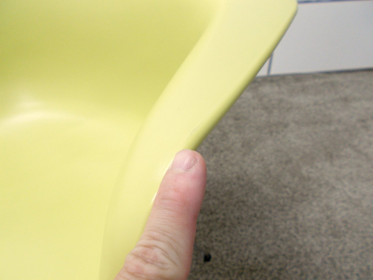 - かなり強い濃い黄ばみ・変色が商品全体にある。(例、座面・背もたれ、脚部等にある。)