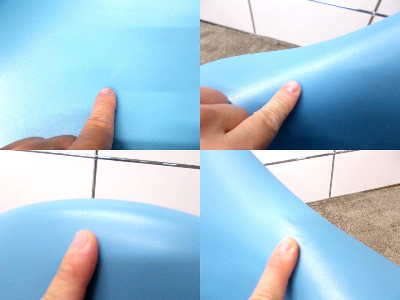 - かなり強い濃い黄ばみ・変色が商品全体にある。(例、座面・背もたれ、脚部等にある。)