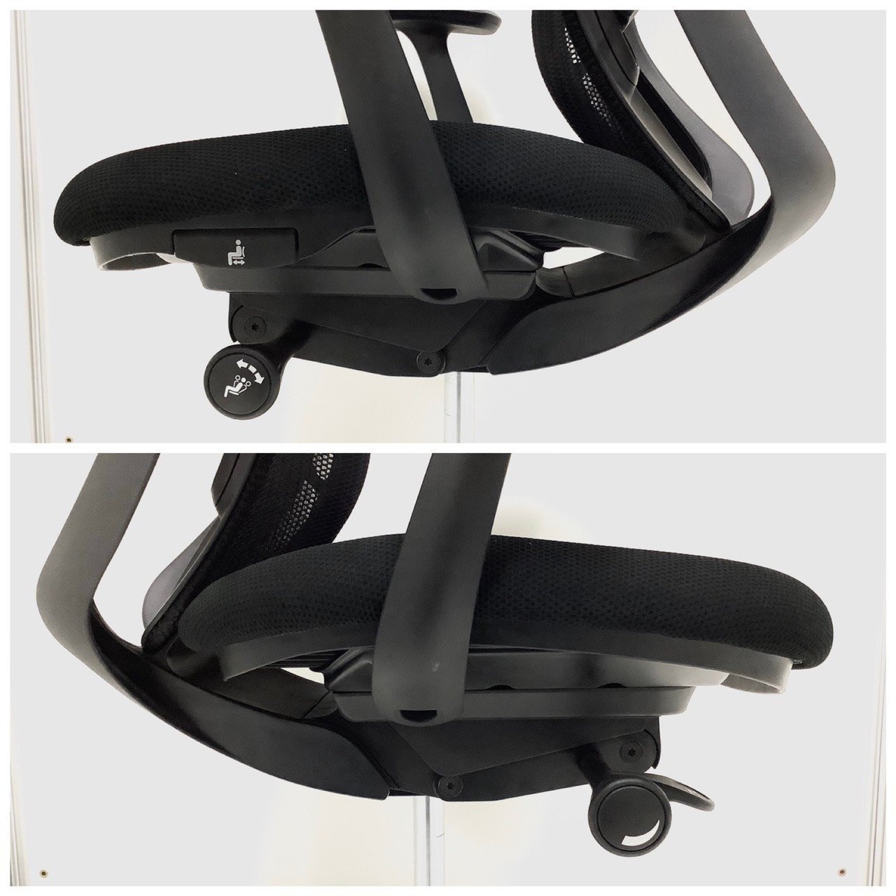 - 座面右下のダイヤル操作で、リクライニングの強弱調整が行えます。これまでのダイヤル式よりも、少ない回転数で、最弱?最強の調整が可能です。