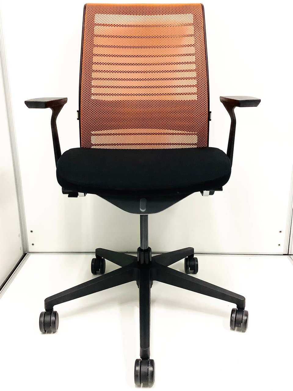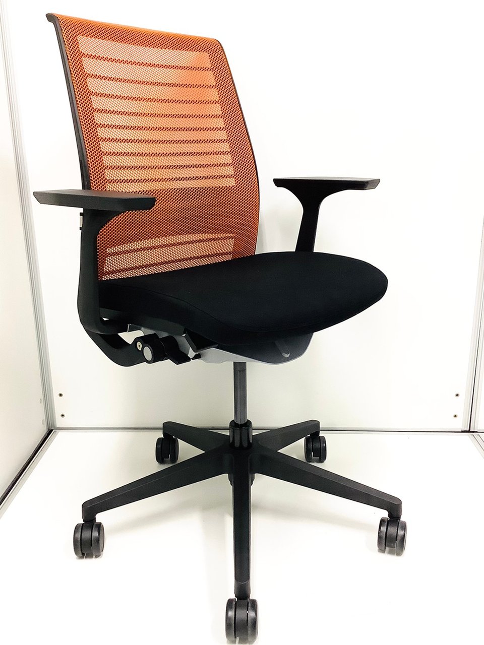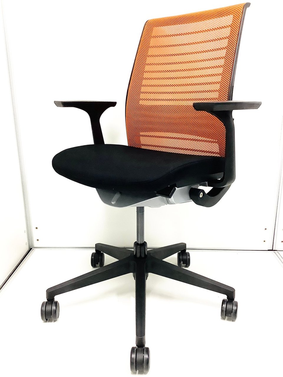 【定価約16万円】【ワイヤーが体にフィットするアメリカ発の大人気商品!長時間の着座ストレスを軽減!】 ■スチールケース(Steelcase)製 シンク(think)チェア 肘付き ハイバック ■メッシュバック ■固定肘/ランバー付 ■背面:オレンジ/座面:ブラック〈岐阜・愛知・三重・静岡・福井〉