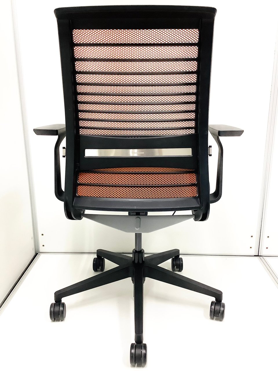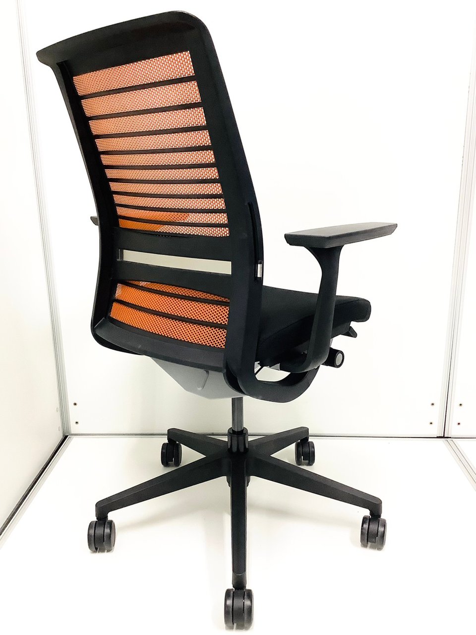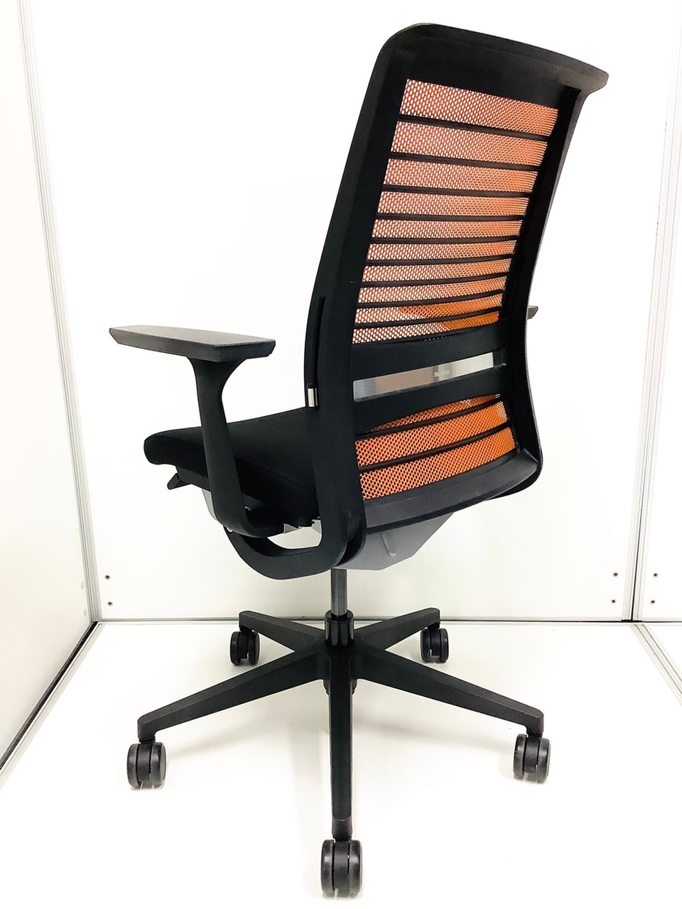 【定価約16万円】【ワイヤーが体にフィットするアメリカ発の大人気商品!長時間の着座ストレスを軽減!】 ■スチールケース(Steelcase)製 シンク(think)チェア 肘付き ハイバック ■メッシュバック ■固定肘/ランバー付 ■背面:オレンジ/座面:ブラック〈岐阜・愛知・三重・静岡・福井〉