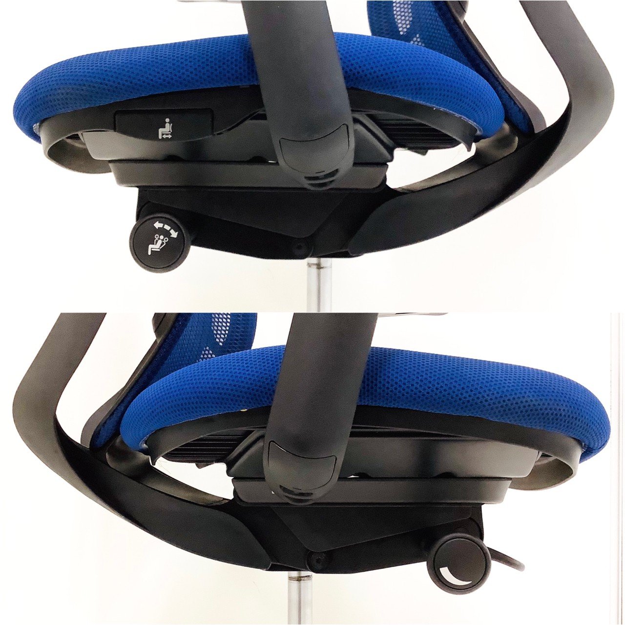 - 座面の左にあるレバー操作により、座面の奥行き調整が可能です。(ストローク:50mm)