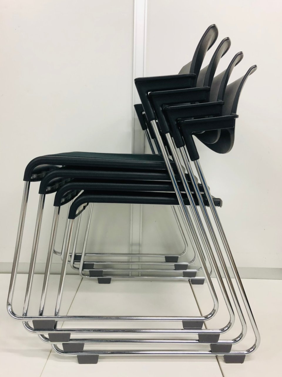 スタッキングチェアなので、重ねて収納可能で御座います。