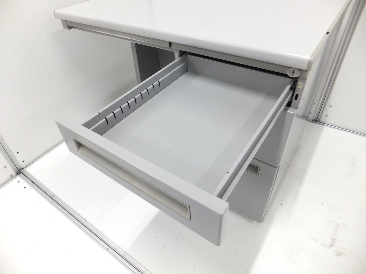 - シンプルながらも使いやすい工夫があります。ロックは、一度の施錠ですべての引出しの鍵がかかるオールロック機構。