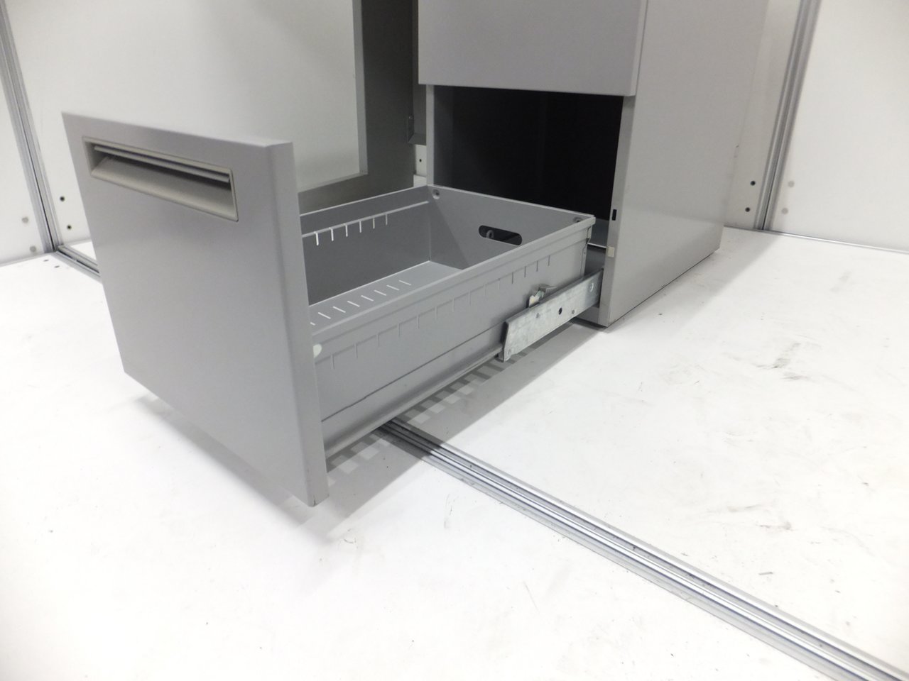引出しを引くのと同時にロックが外れるラッチ機構を採用しています。