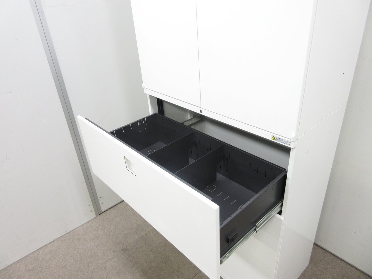 スライド式の扉+引き出しタイプの便利な書庫セットが入荷!使い勝手抜群のハイキャビネットが入荷! ■オカムラ/レクトライン/ホワイト 2枚引き戸+3段ラテラルキャビネット