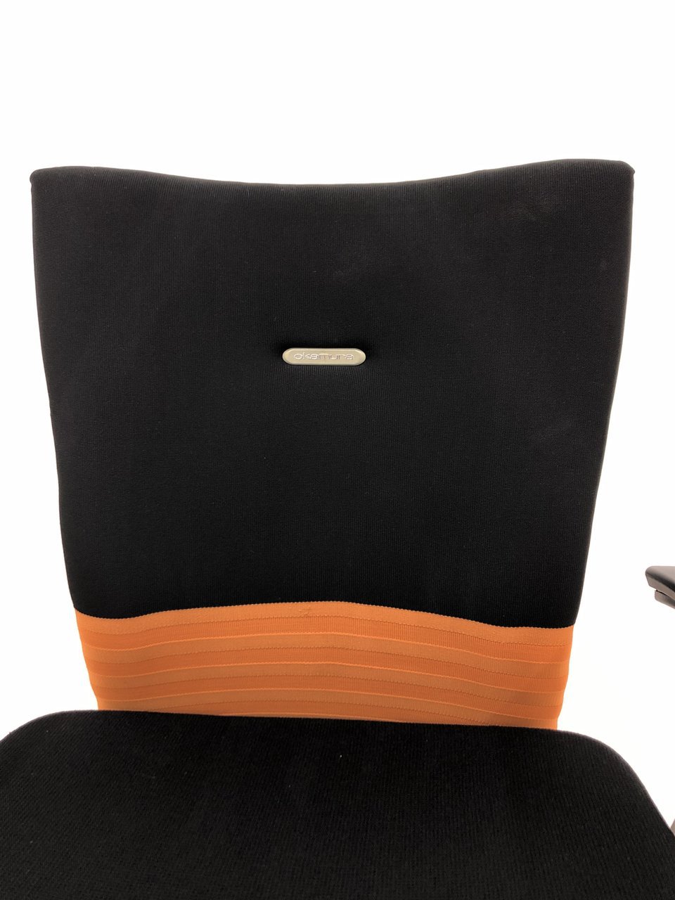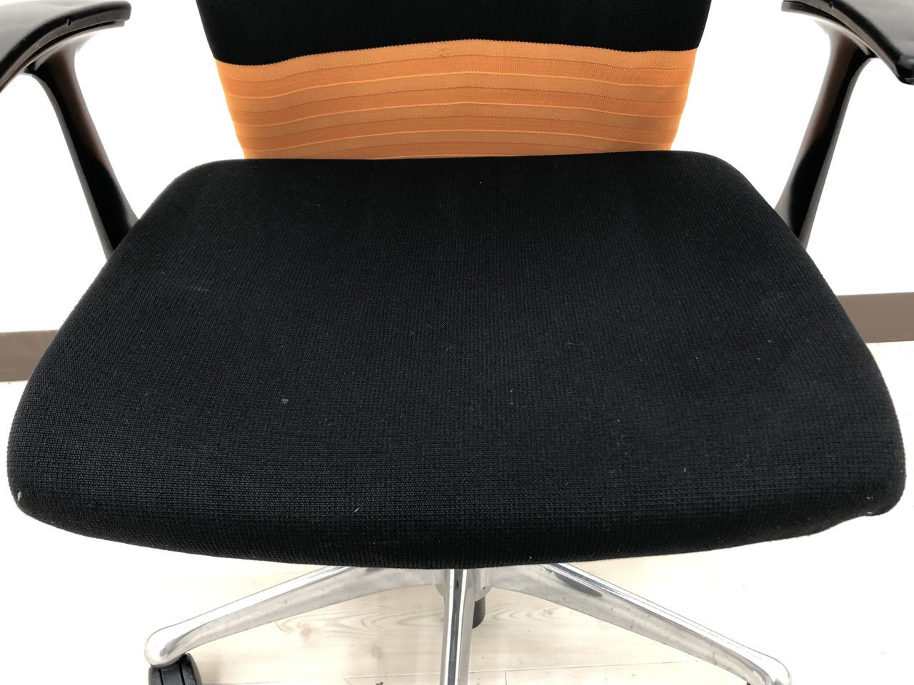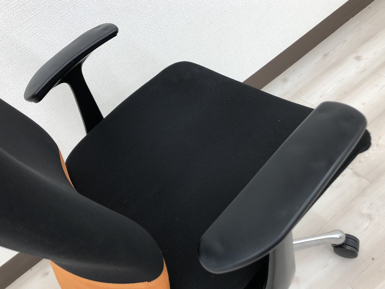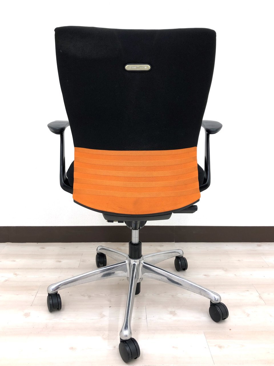 【人間工学に基づいた快適な座り心地!背あてのしなやかな曲線が背中にフィット!】■オカムラ製 フィーゴチェア (feego) 肘付きミドルバック シームレスタイプ ■固定肘 ■ブラック×オレンジ ※コートハンガー外し跡のある商品となります。【入替セールにつき30%OFF!】