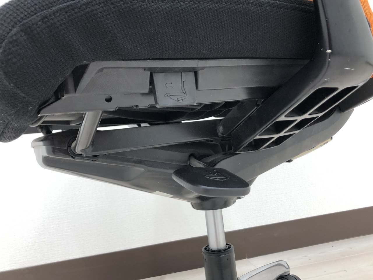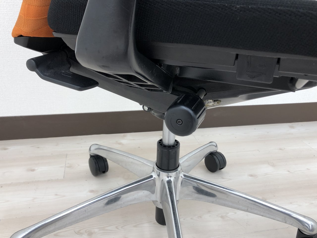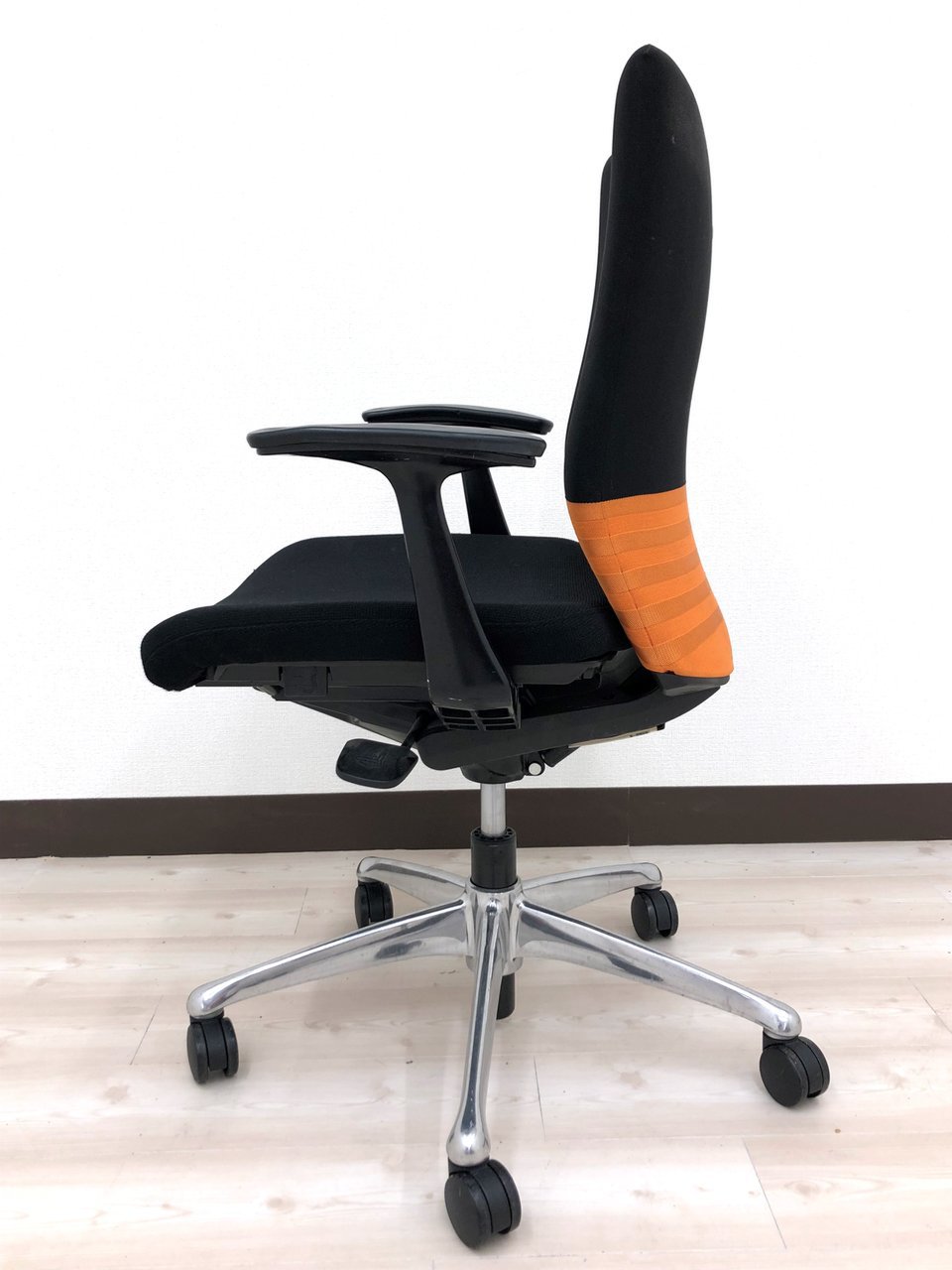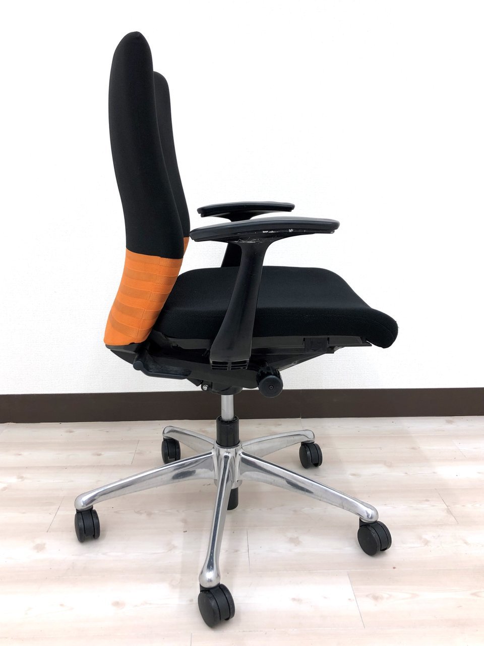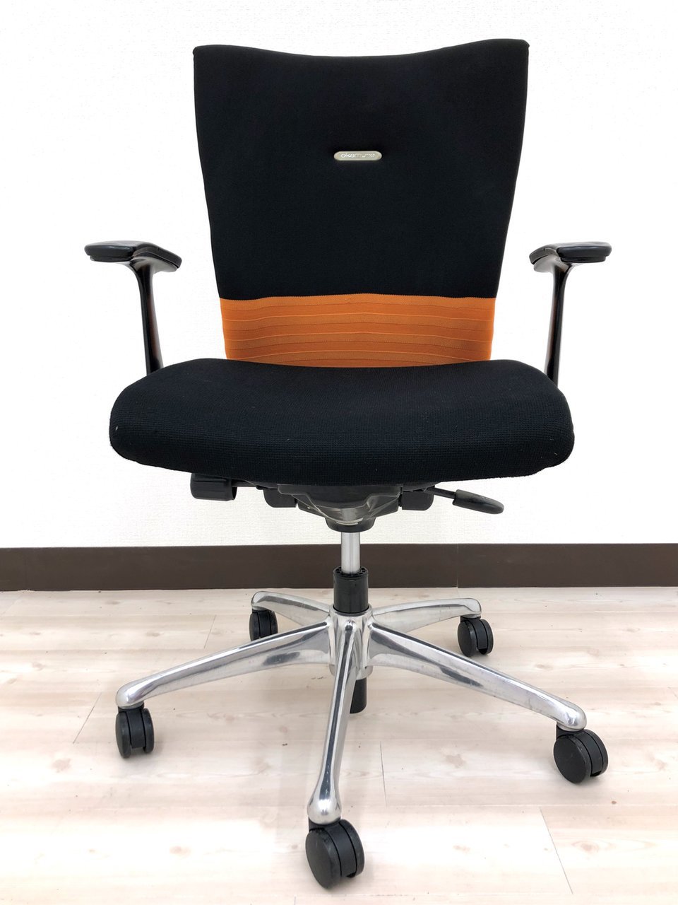 【人間工学に基づいた快適な座り心地!背あてのしなやかな曲線が背中にフィット!】■オカムラ製 フィーゴチェア (feego) 肘付きミドルバック シームレスタイプ ■固定肘 ■ブラック×オレンジ ※コートハンガー外し跡のある商品となります。【入替セールにつき30%OFF!】