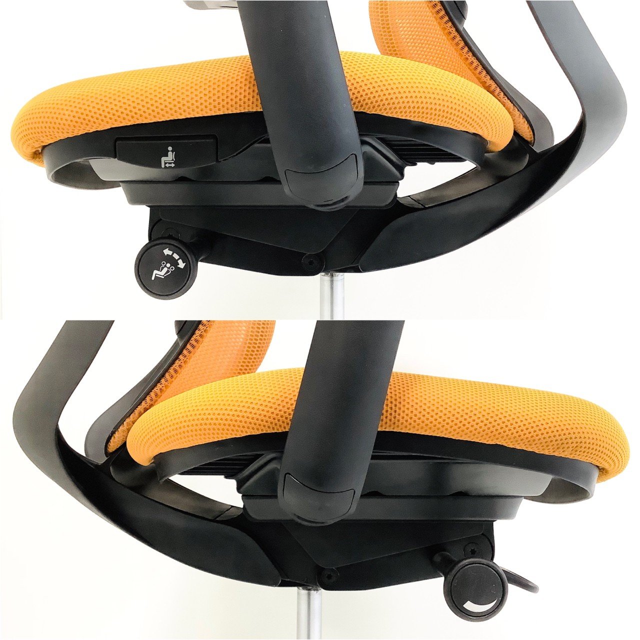 - 座面右下のダイヤル操作で、リクライニングの強弱調整が行えます。これまでのダイヤル式よりも、少ない回転数で、最弱?最強の調整が可能です。