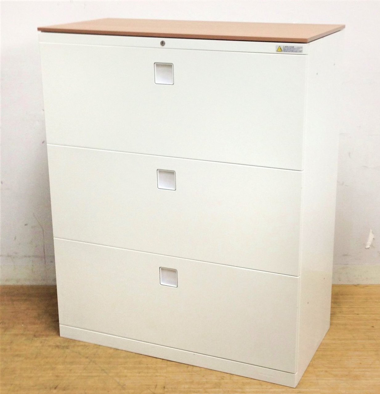 オカムラ レクトライン 3段ラテラル書庫 ホワイト天板 シリンダー錠 鍵付き ※取っ手部分に若干日焼けあり