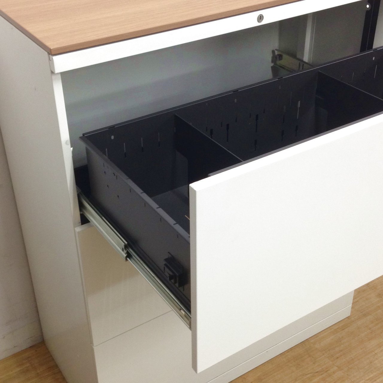 【使いやすさで選ぶならコレ!大容量の三段キャビネット】■オカムラ(Okamura)製 レクトラインシリーズ(Rectline) 3段ラテラル書庫 ローキャビネット ■天板付き ■シリンダー錠 ■ホワイト